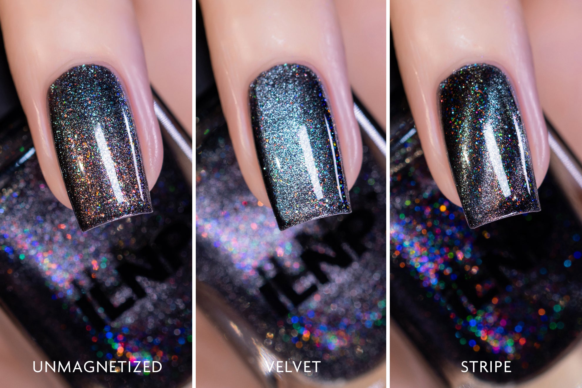 Overload is a magnetic effect nail polish, a standout formula with metal shavings that shimmer on their own but require a magnet to attract the metallic particles into their signature effect!