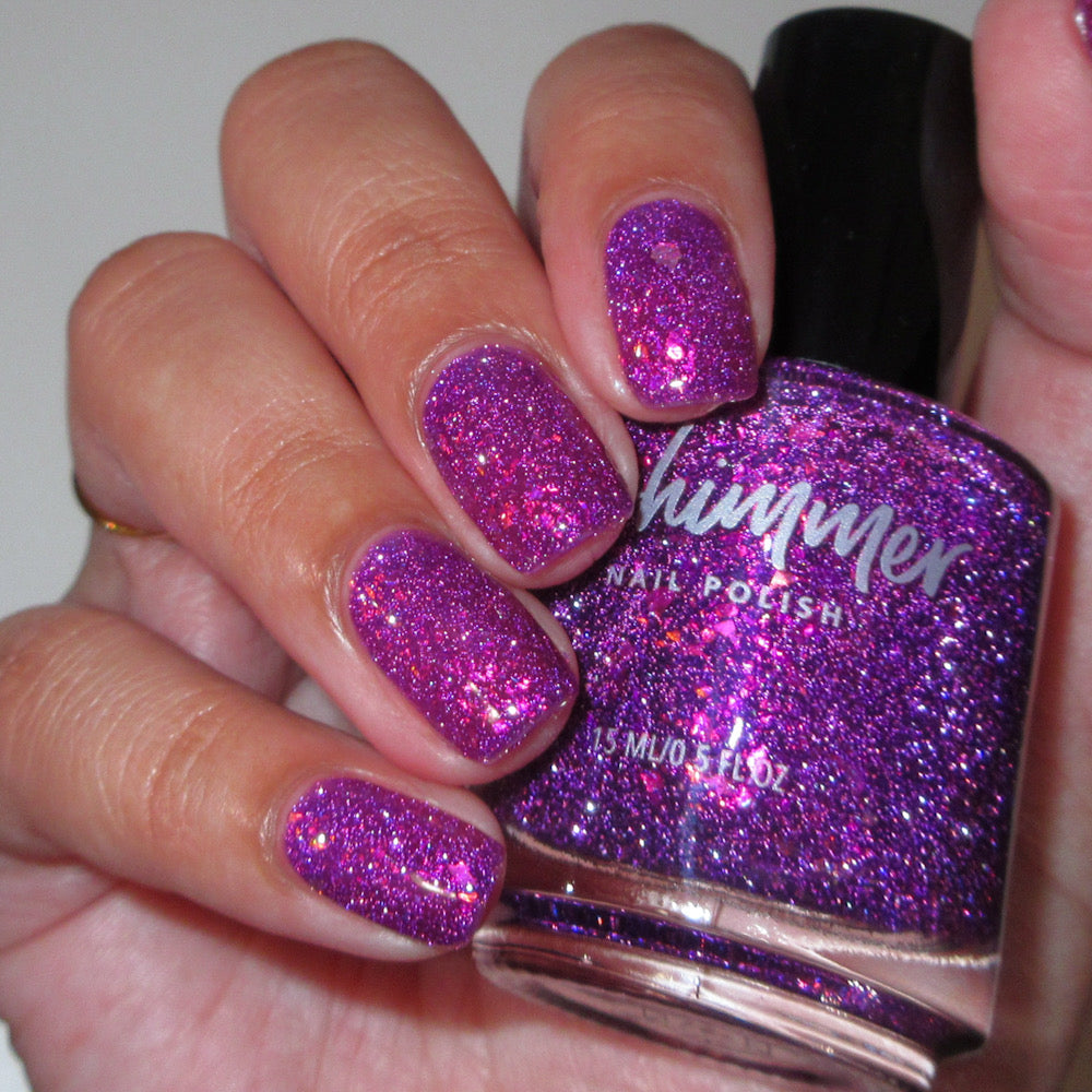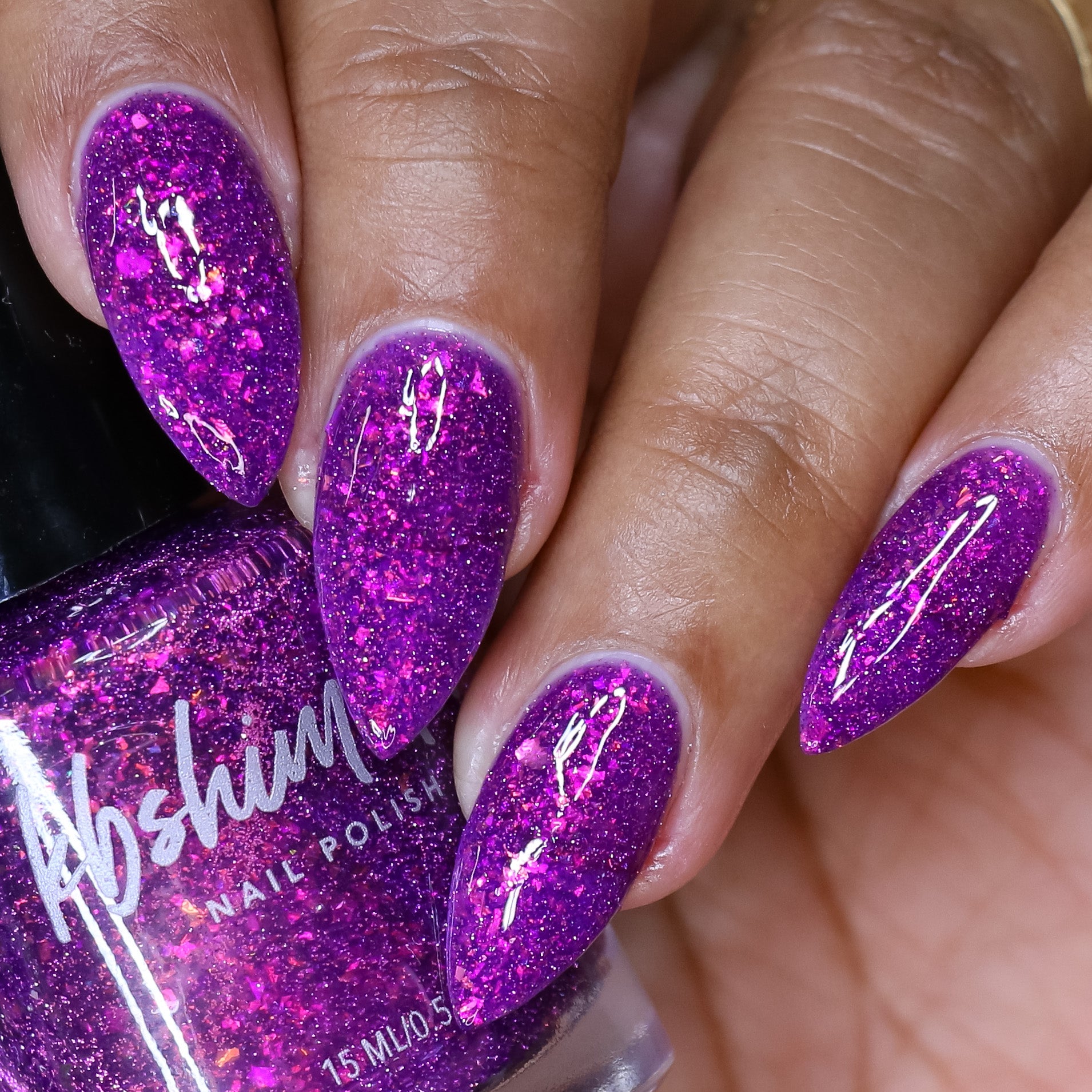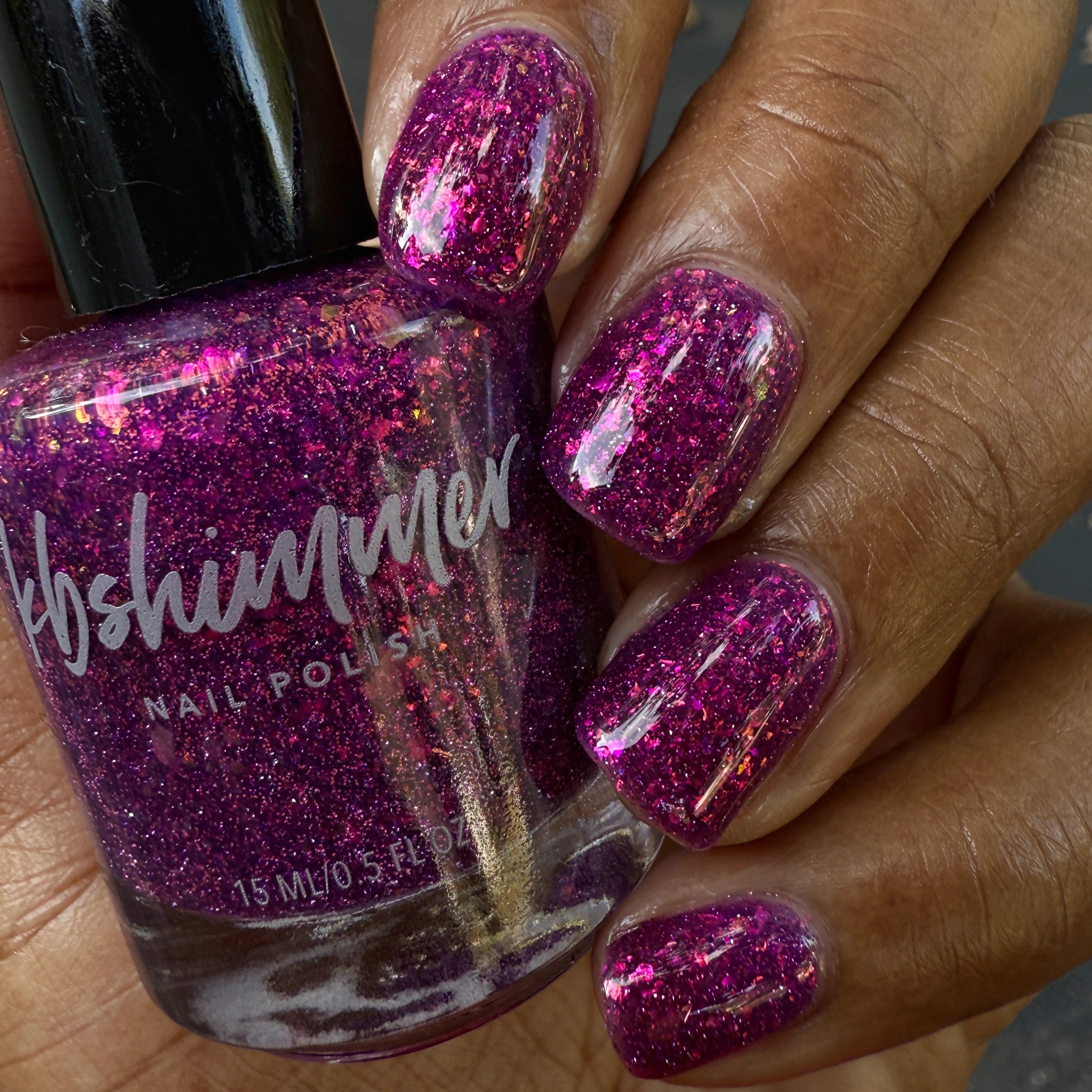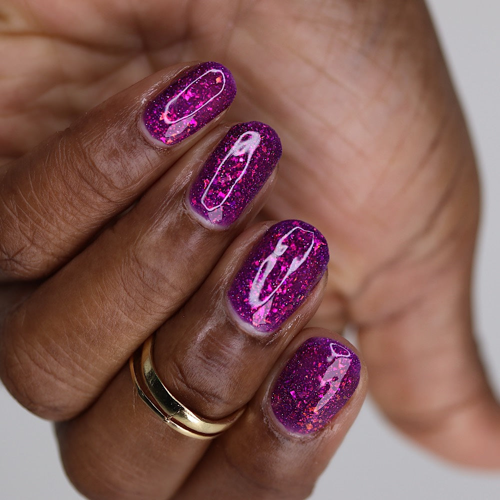 Blanket Statement is a purple jelly nail polish with raspberry undertones. A scattering of fuchsia reflective glitters comes alive in light and with flash, adding a fun glittering effect. Color-shifting flakes steal the show, flashing from pink to gold, to orange and lime, for a show-stopping shade that will enthrall you. For the best shine, follow with a coat of Smooth Moves Glitter Topper and a coat of Clearly On Top quick-dry topcoat.