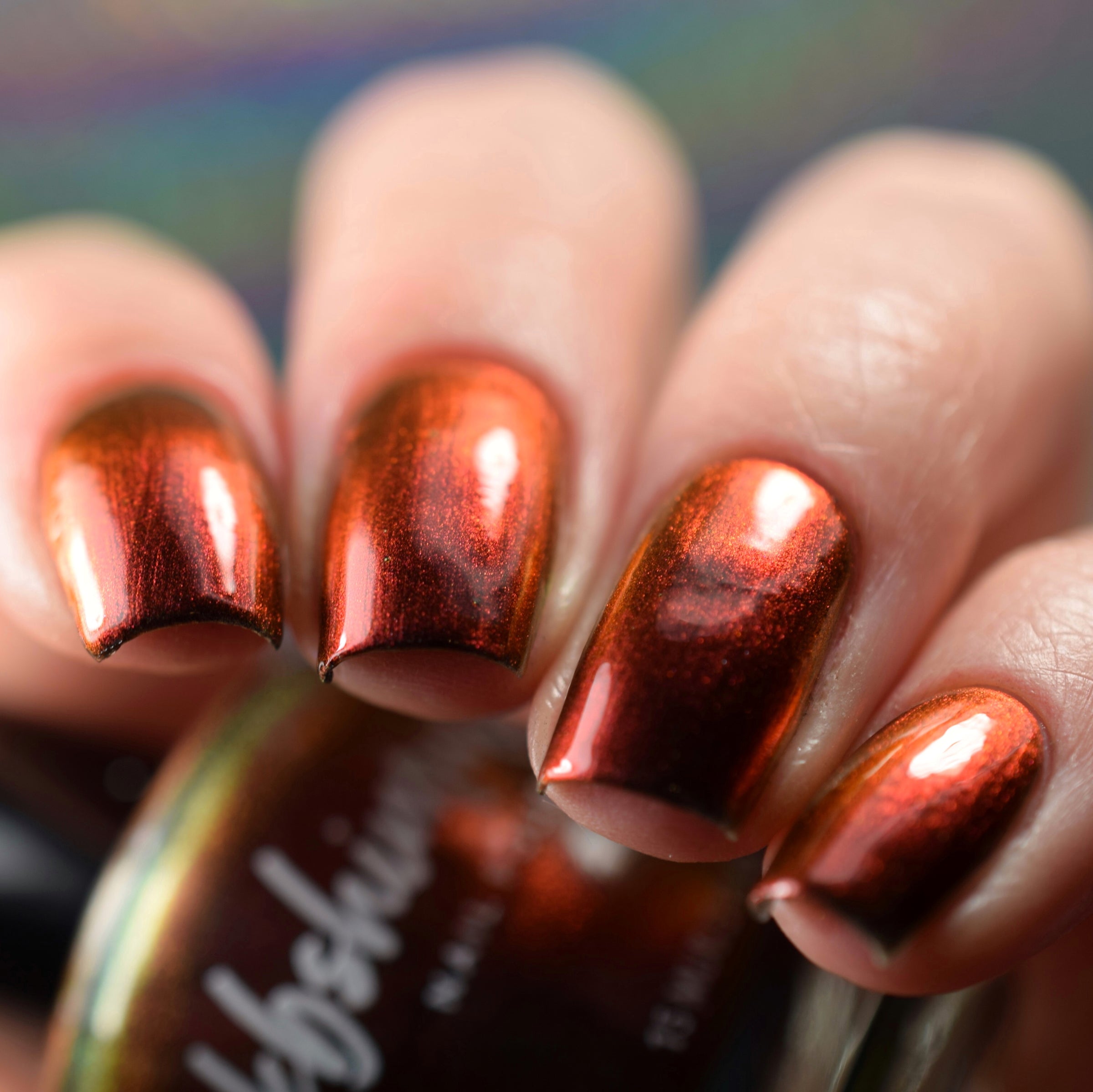 Obsidian is a new addition to our color-shifting multichrome nail polish line. Obsidian features a deep black hue that shifts to molten shades of umber, crimson, orange, and gold. Obsidian covers well in 2-3 coats.