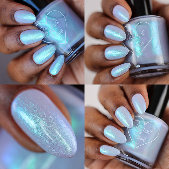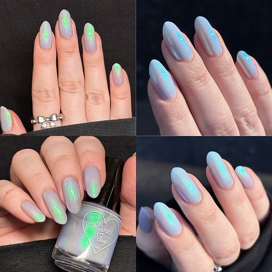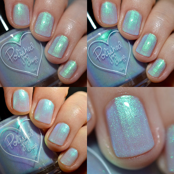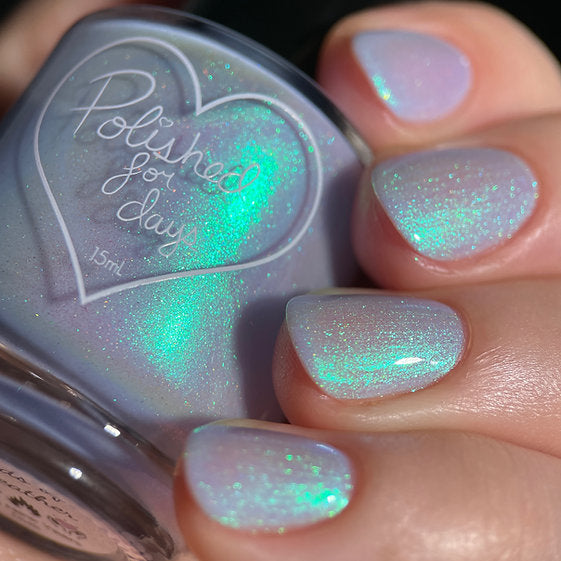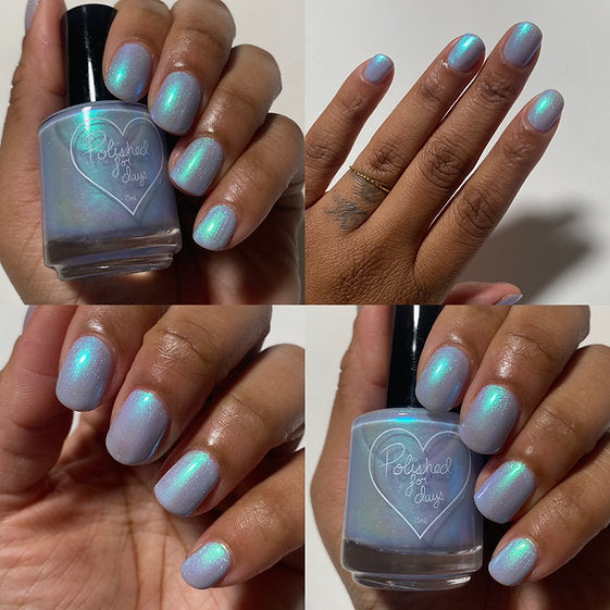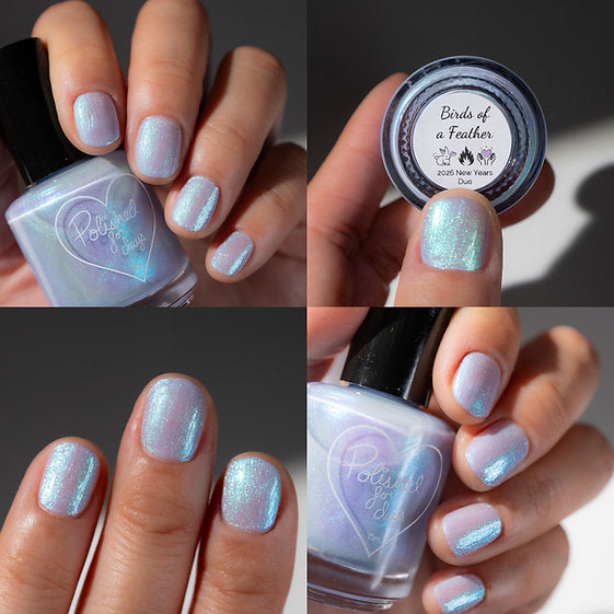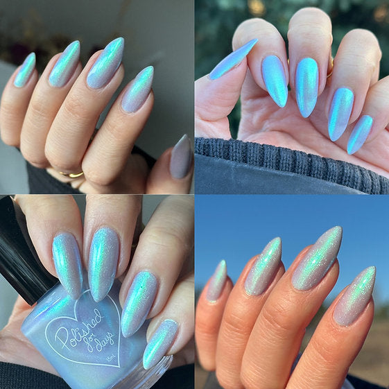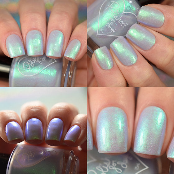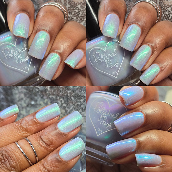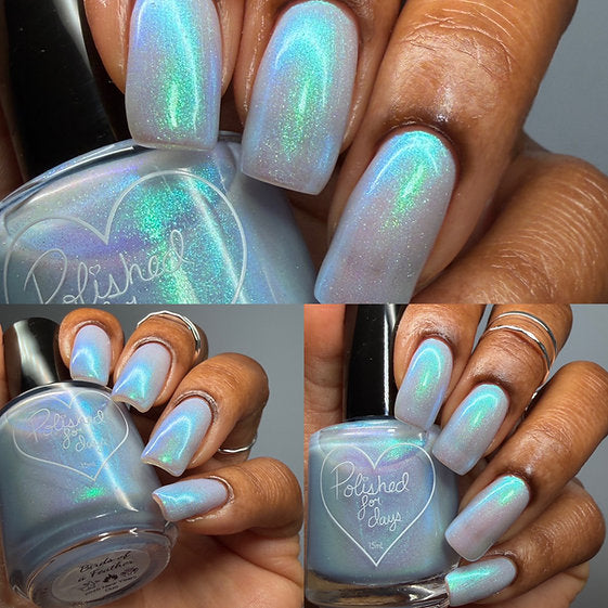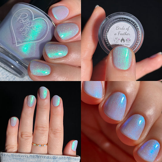 Polished for Days Birds of a Feather is a cool greyed slightly purple tinted base with a strong green-blue-purple iridescent shifting shimmer and a light scattering of holographic micro flakes.