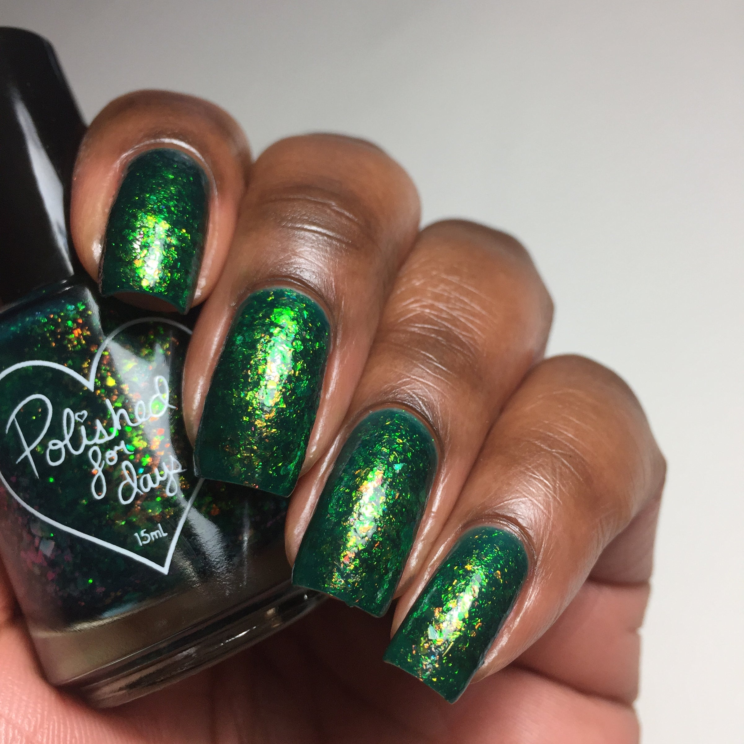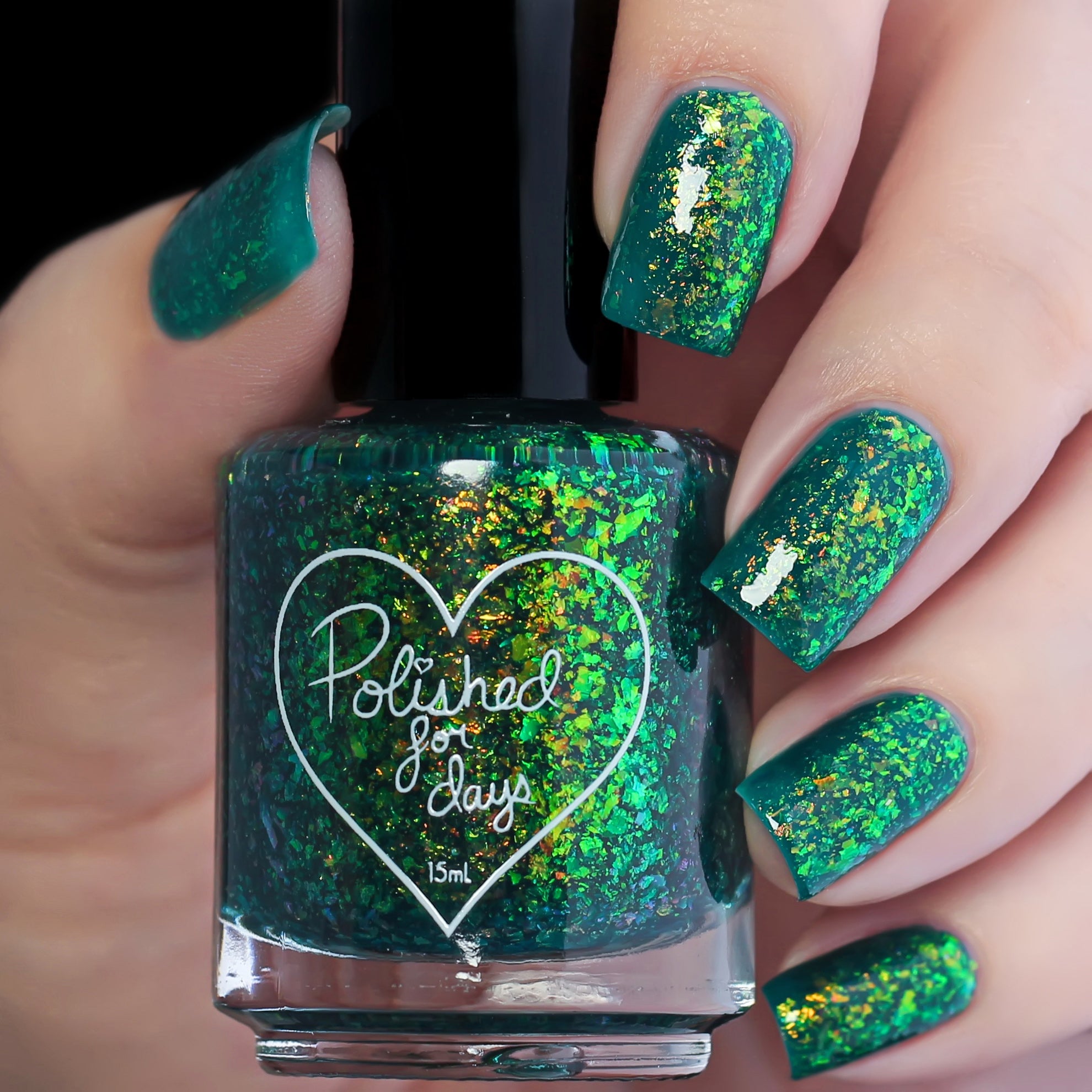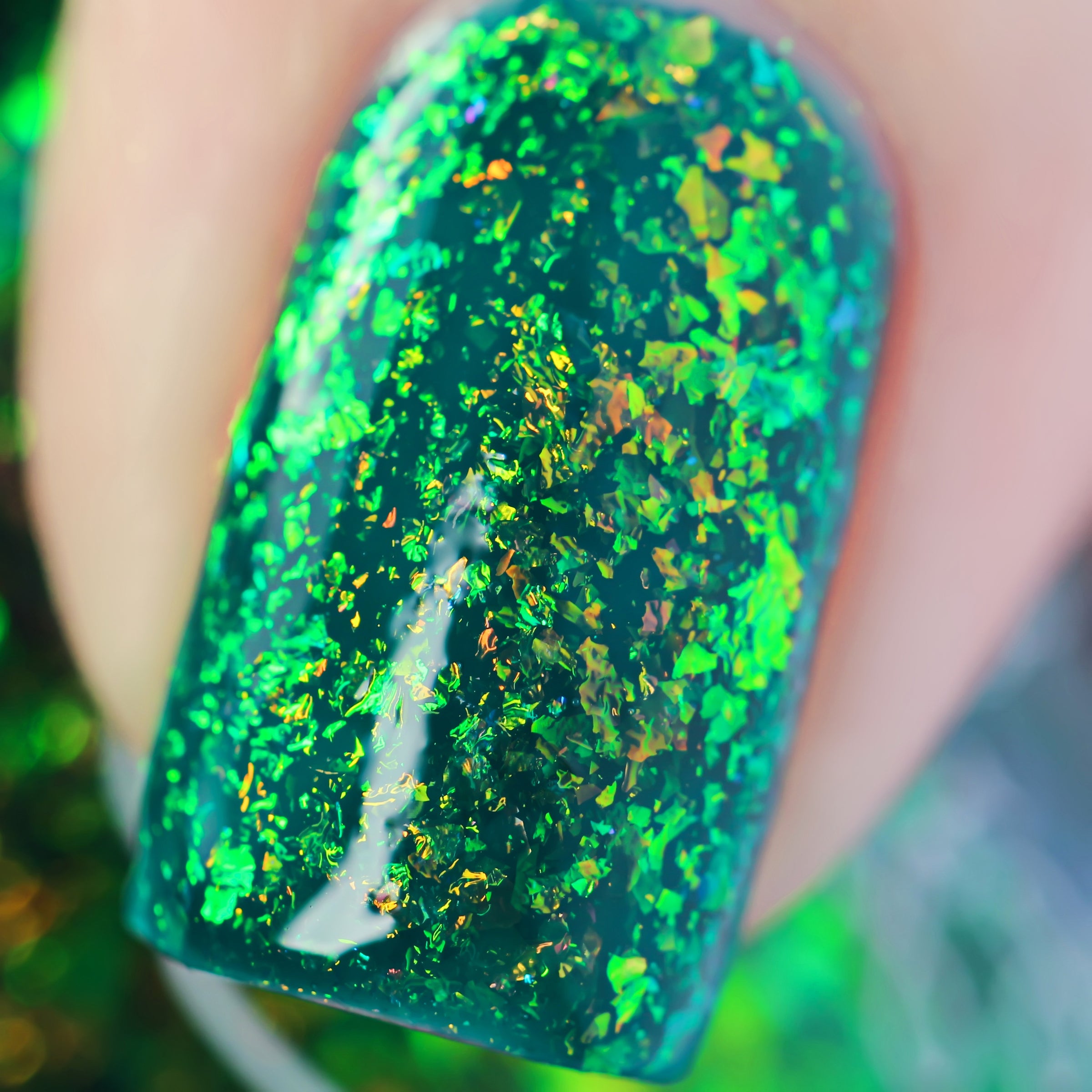 Polished for Days Clover is a pine green base packed with yellow-orange-green shifting iridescent flakes.