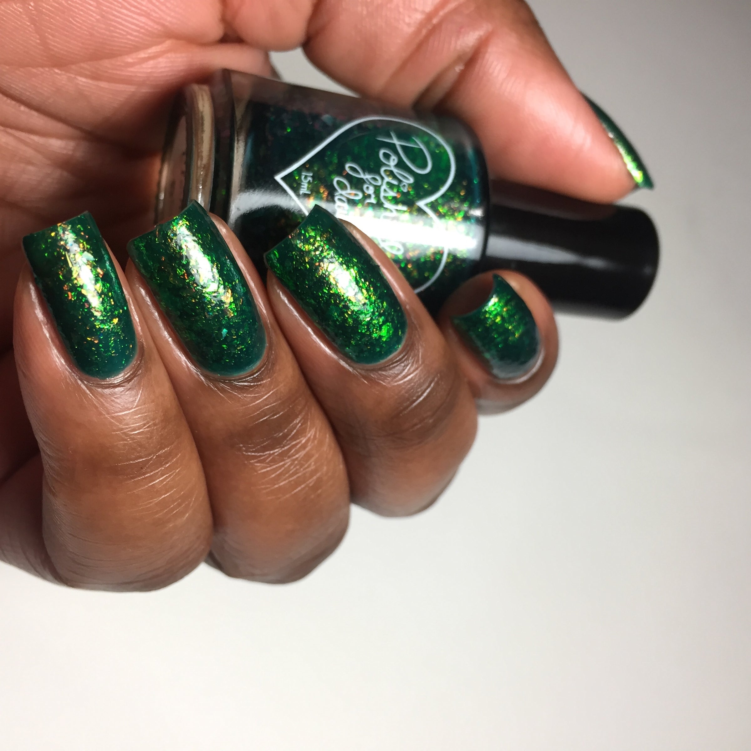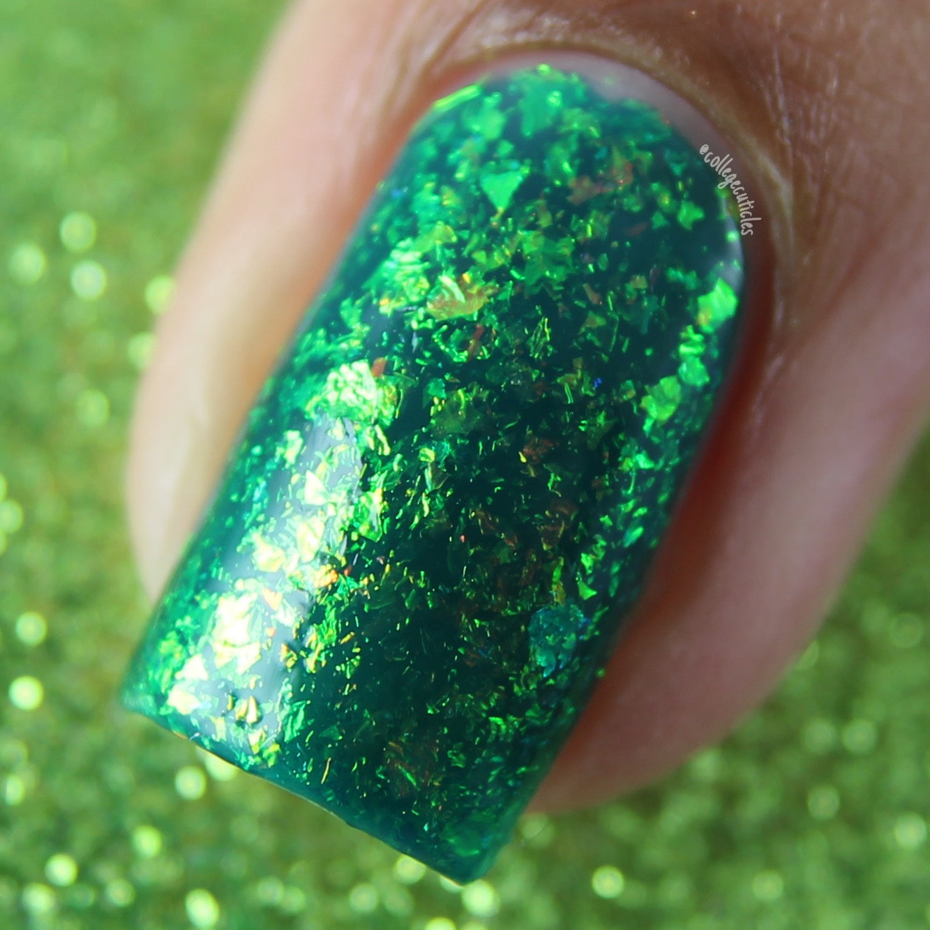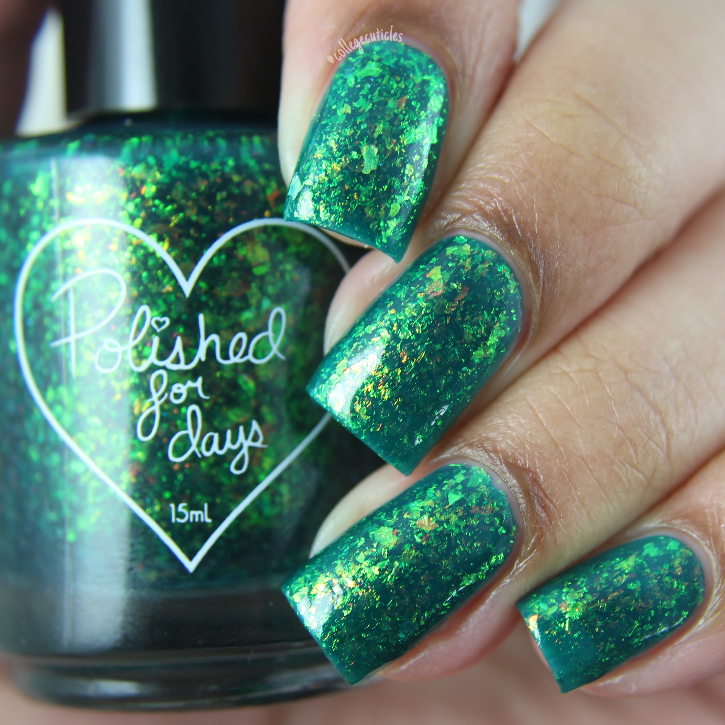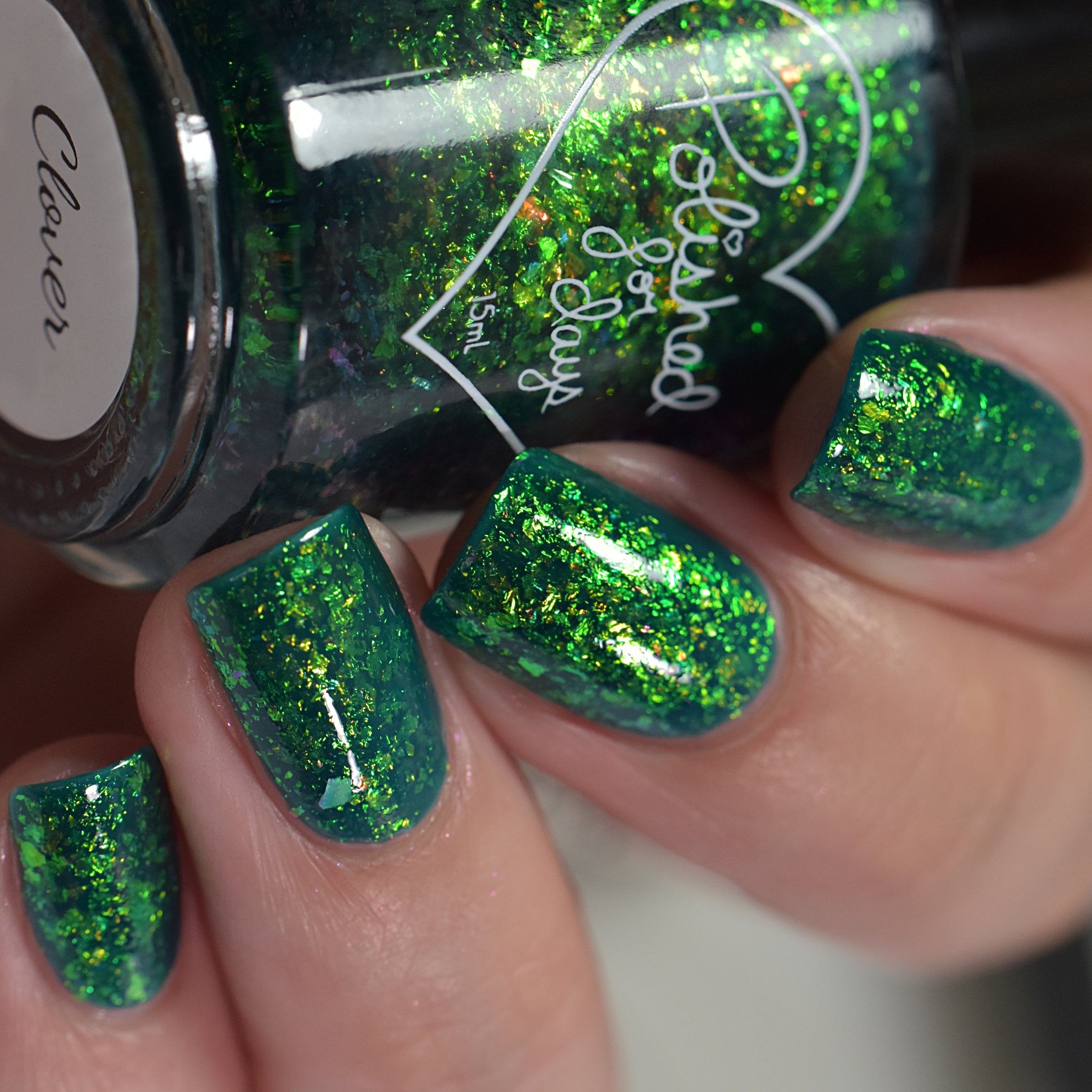 Polished for Days Clover is a pine green base packed with yellow-orange-green shifting iridescent flakes.