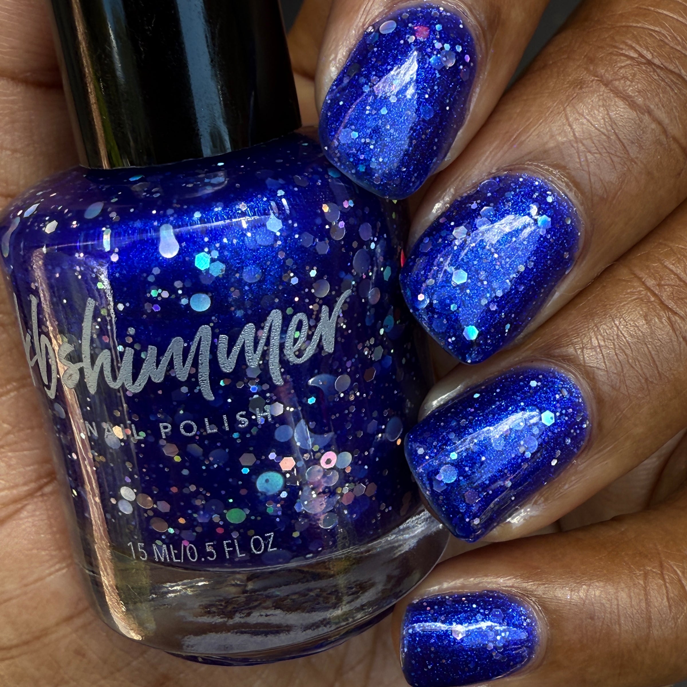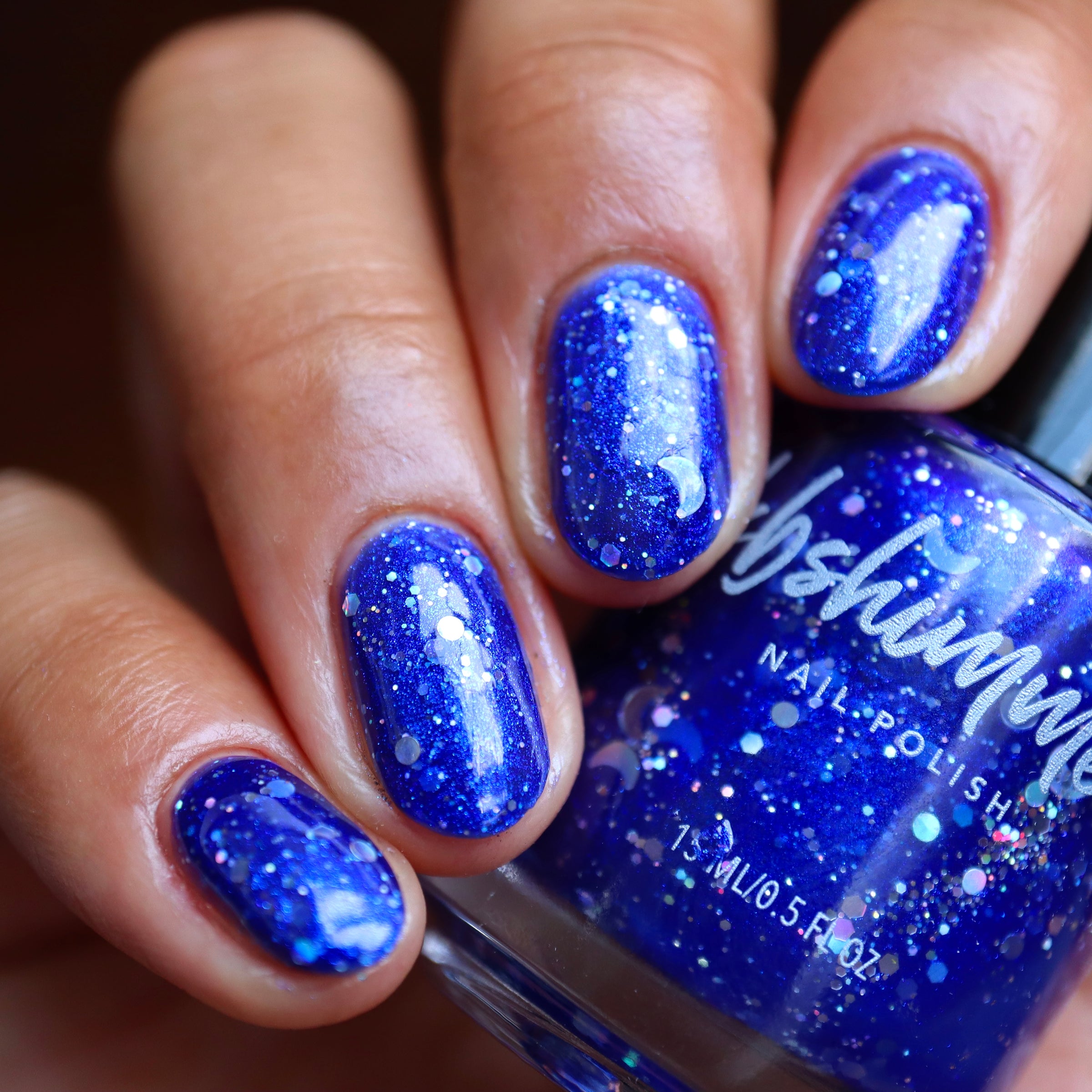 Constellation Prize is a bold and shimmery cobalt blue nail glitter nail polish. Like stars in the sky, mini silver hex holographic glitters float in the base, catching the light for an enchanting twinkle. Larger silver dots mimic stars, creating out-of-this-world sparkle. If lucky, you may catch a crescent moon, but if not, don’t worry—each polish includes a mini bag with holo silver full and crescent moons for easy nail art placement. Apply 2 coats of polish as normal, then use the polish brush or tweezers to place a moon if desired. For a glass-like finish, follow with a coat of Smooth Moves Glitter Topper and a coat of Clearly On Top quick-dry topcoat.