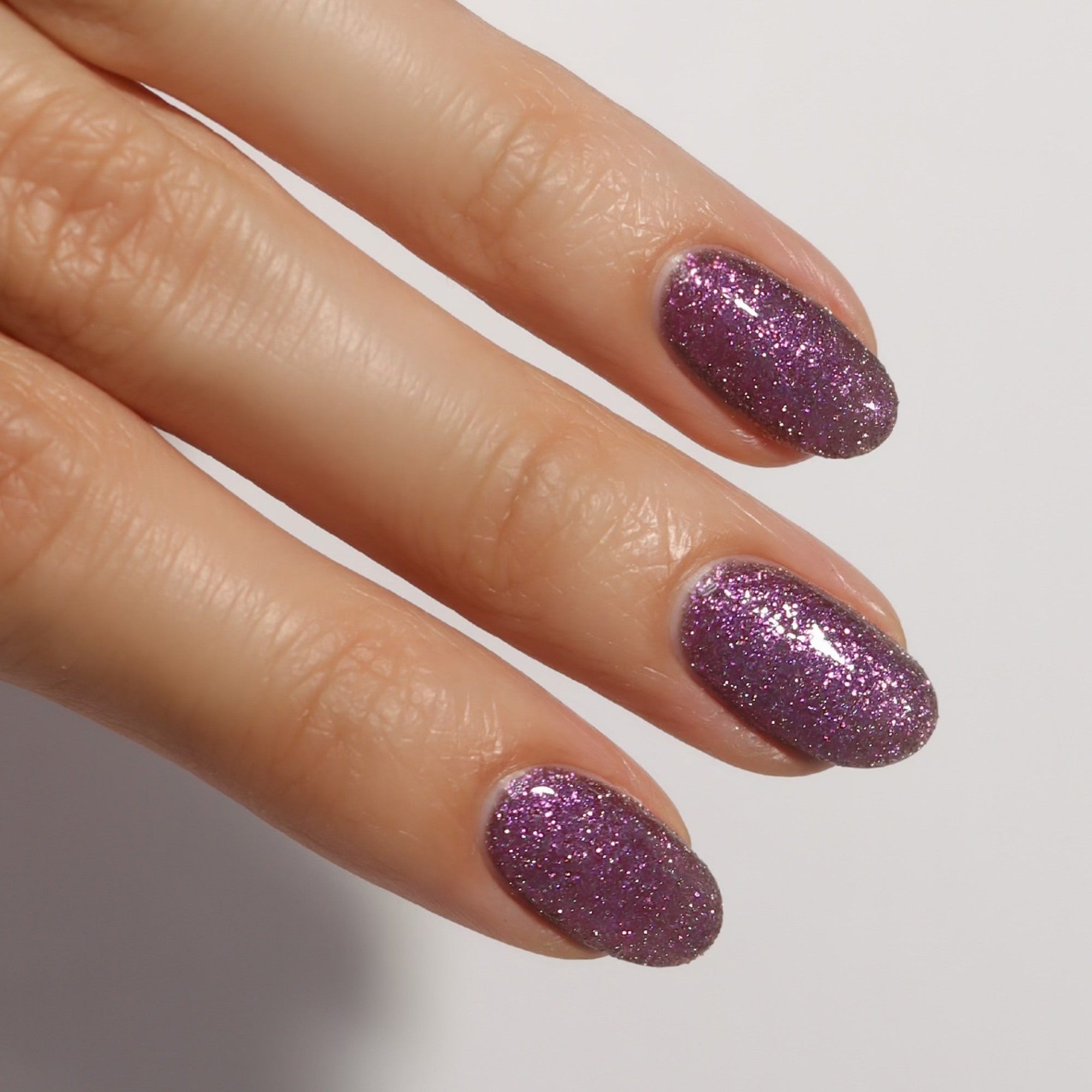 Foxglove is a smoky purple nail polish with pink to violet duochrome shimmer and dazzling reflective sparks. Our Spotlight Shimmers™ combine glimmering shimmer pigments and flash reflective glitters which illuminate your nails with direct lighting.
