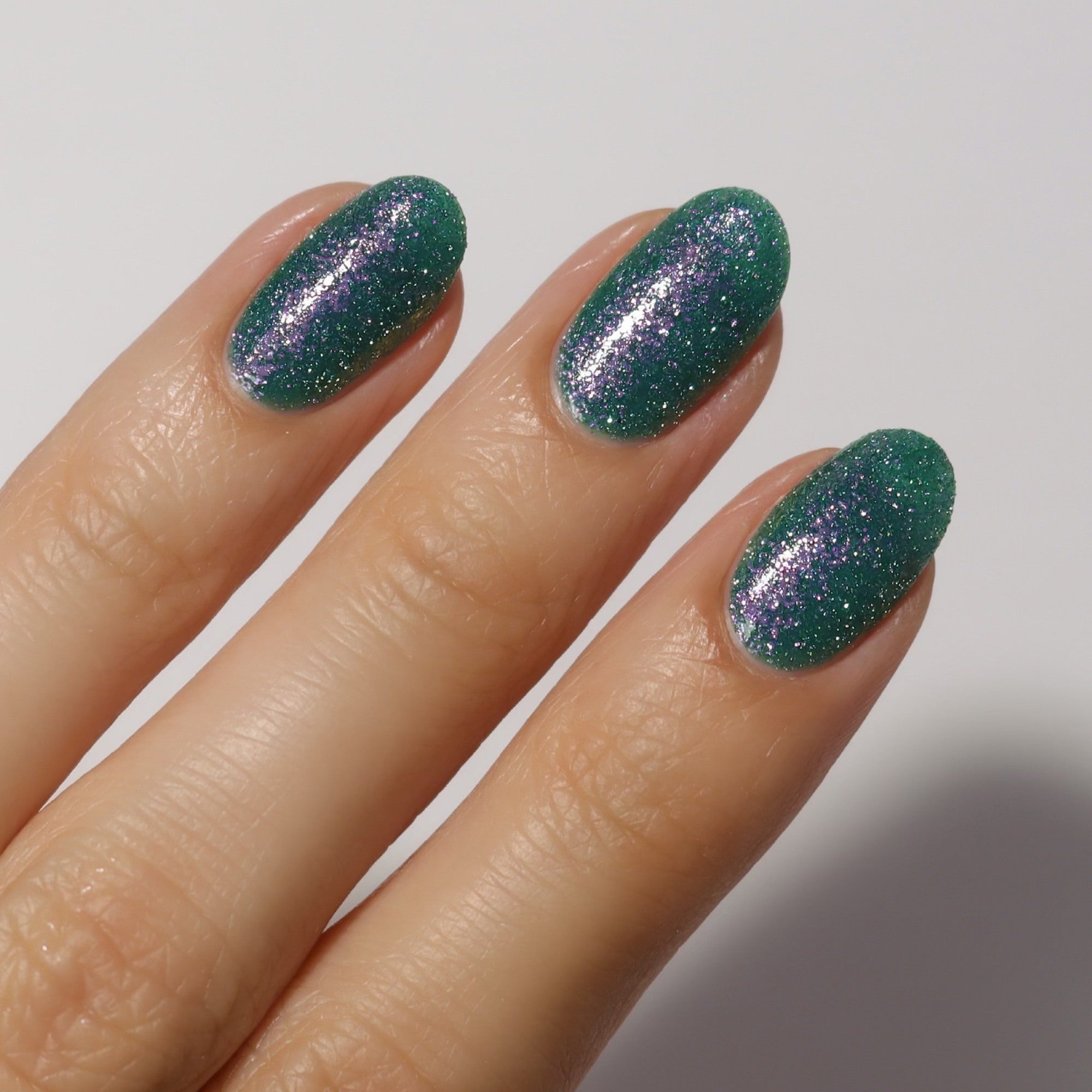 Fresh leaves in shadow, the gleam of sunlight on glass vials, a whispered recipe you’re not supposed to know. This green has an almost medicinal clarity under the shimmer, yet the flash glitter makes it glint like a secret. Beautiful, but you probably shouldn’t drink it.