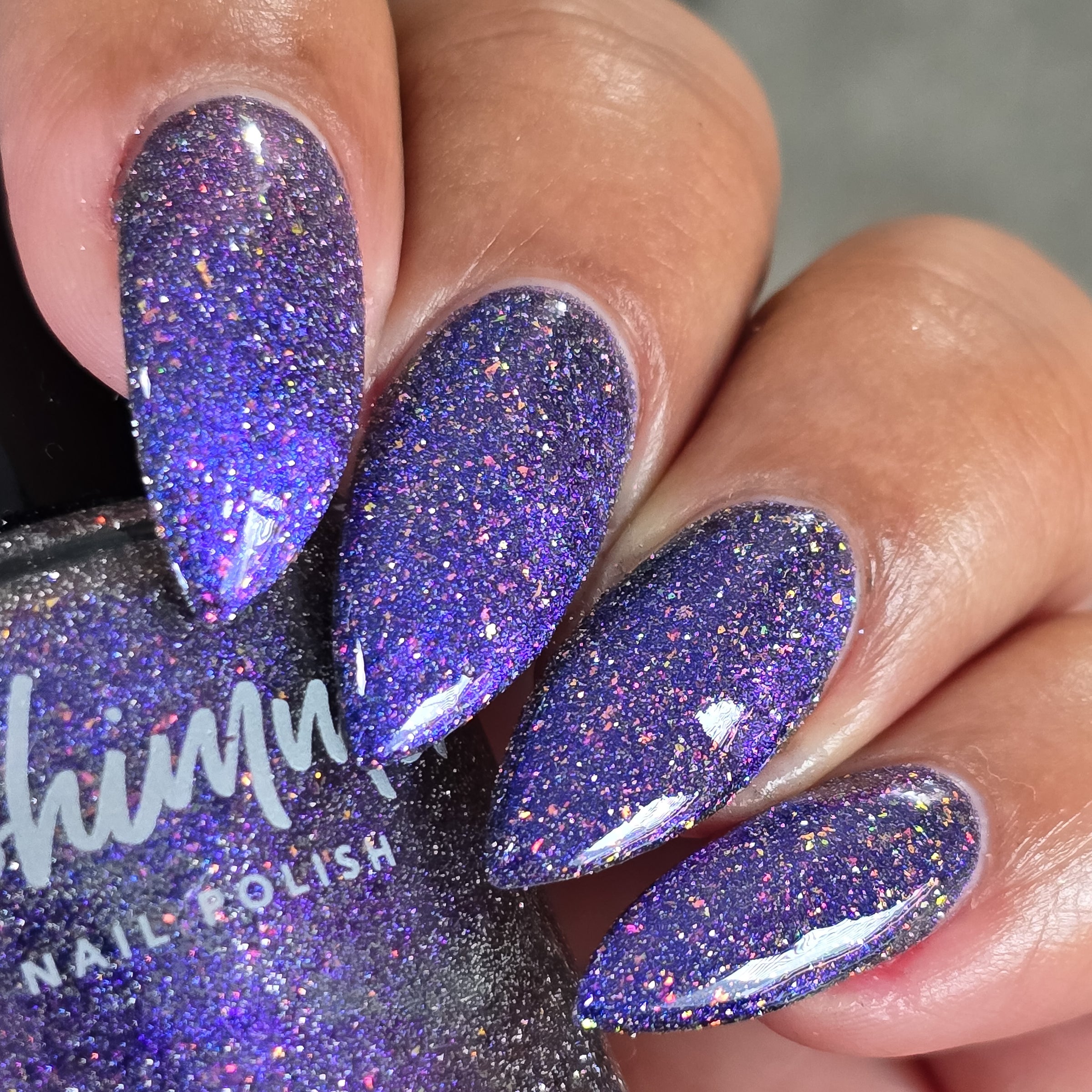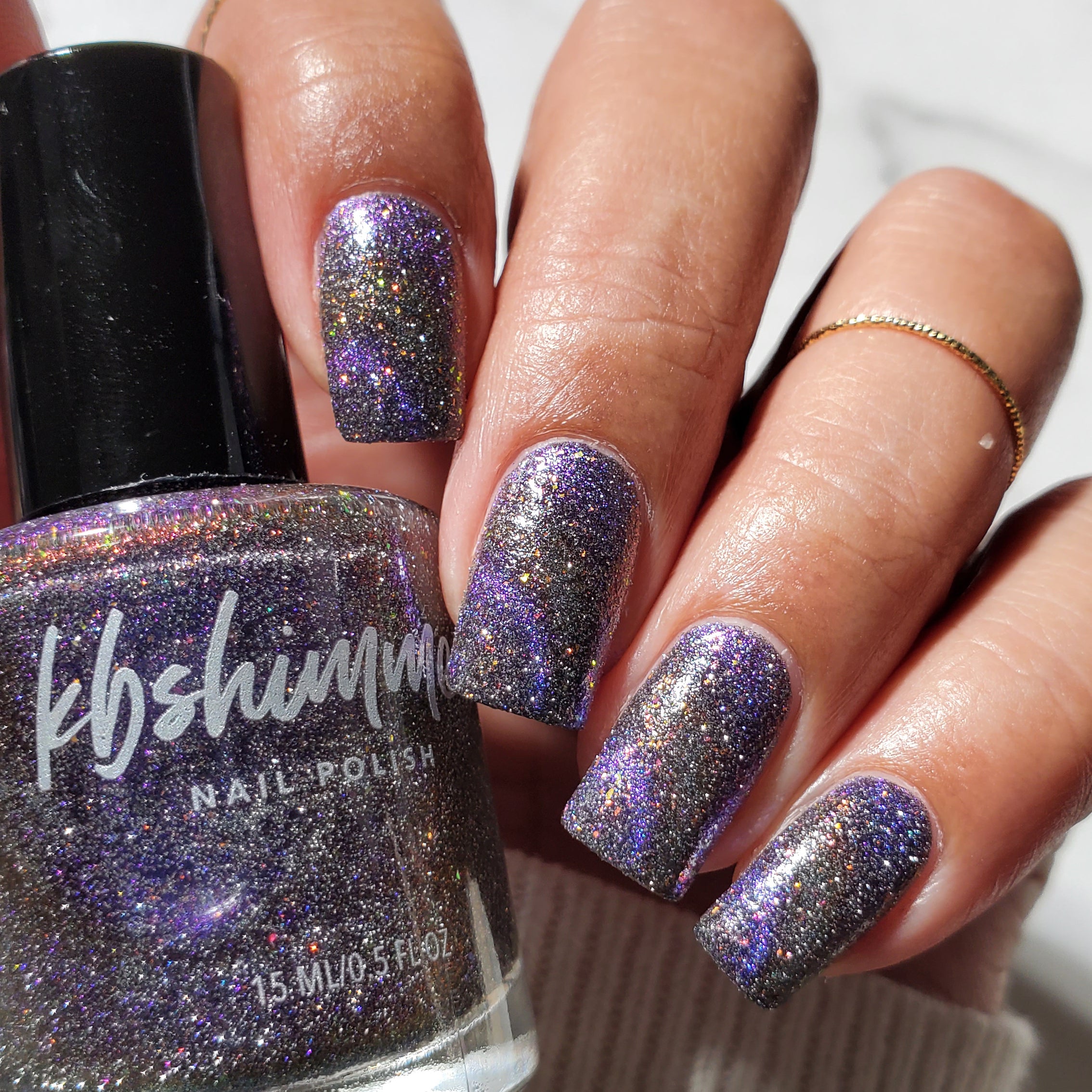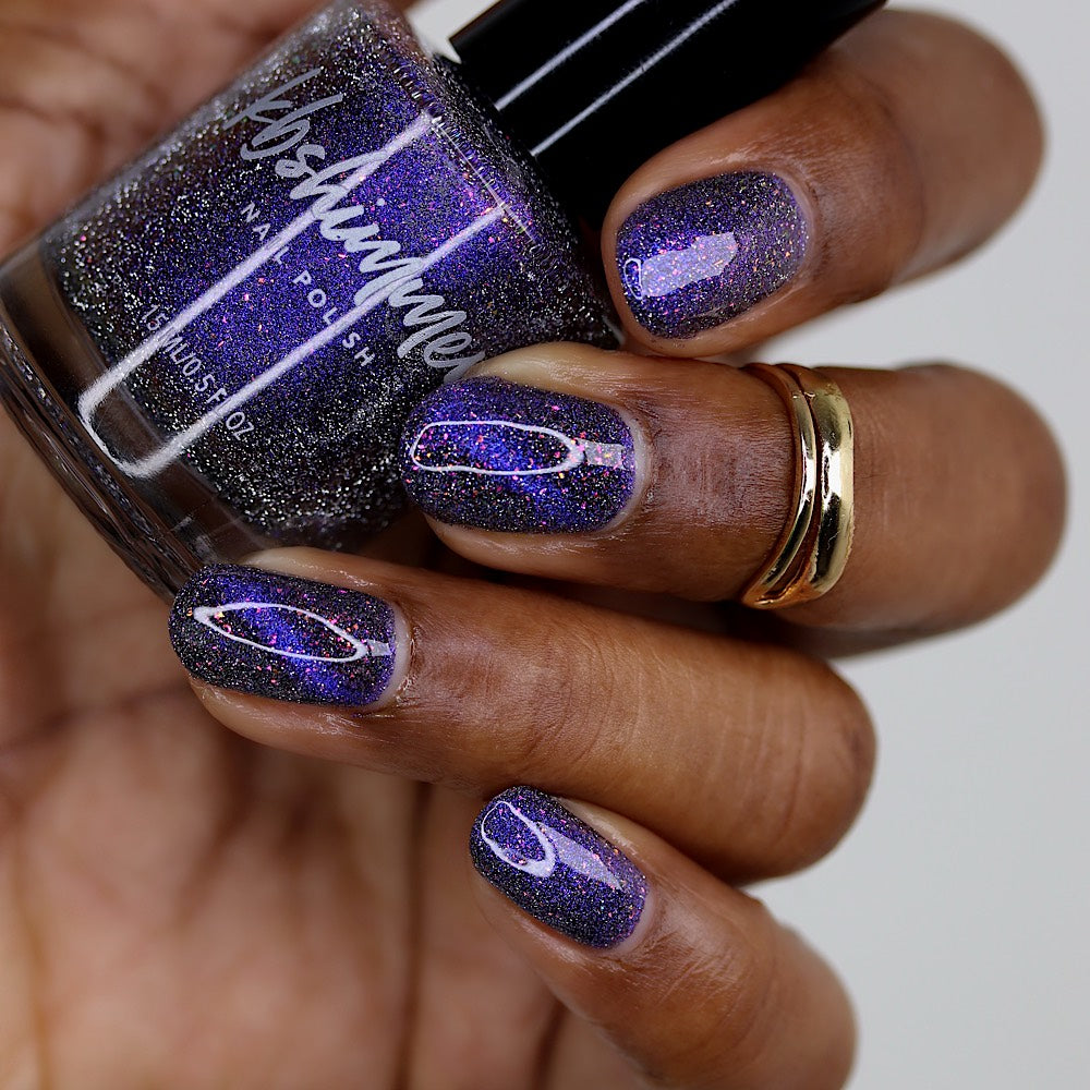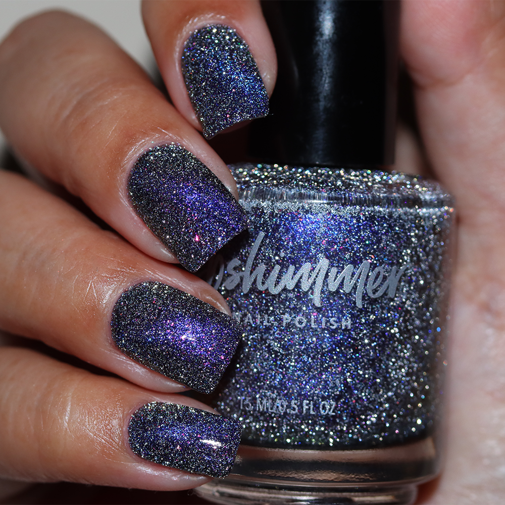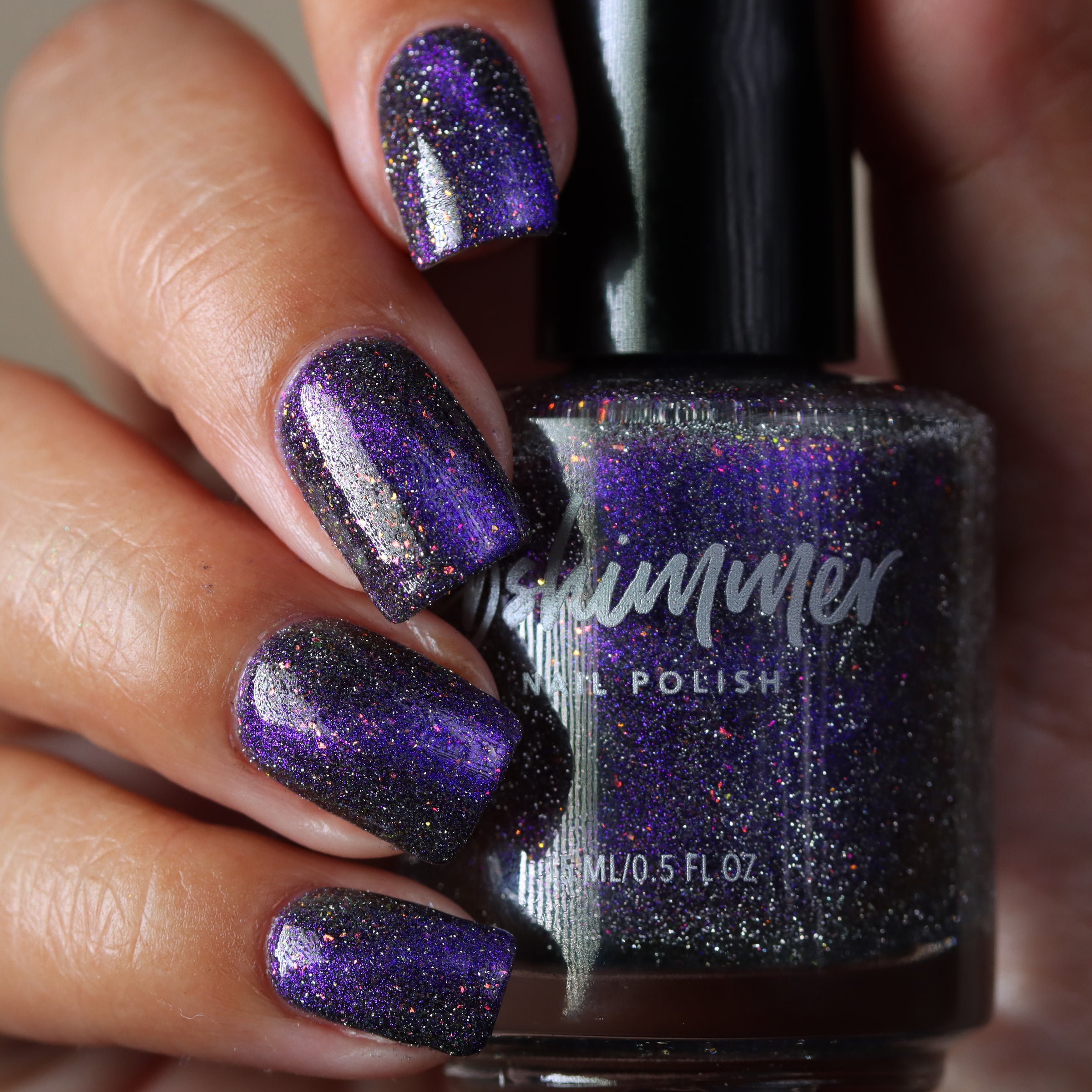 I’ll Bewitch You Shortly is an enchanting reflective, shifty nail polish made to twinkle and shine with magnetic properties. When worn without a magnet, an indigo-to-blue-to-midnight shift sets off magical pink sparks that shift into orange and gold. In brighter light or under flash, silver reflective glitter comes out to play, amping up the blue shade. When used with a magnet, the black background sets off the sparks and the purple-to-blue shift of the magnetic pigment. Wear without topcoat for a fun textured look (the maker’s favorite). For a glass-like finish, follow with a coat of Smooth Moves Glitter Topper and a coat of Clearly On Top quick-dry topcoat. This shade looks magical both with and without using a magnet, so try wearing it both ways!