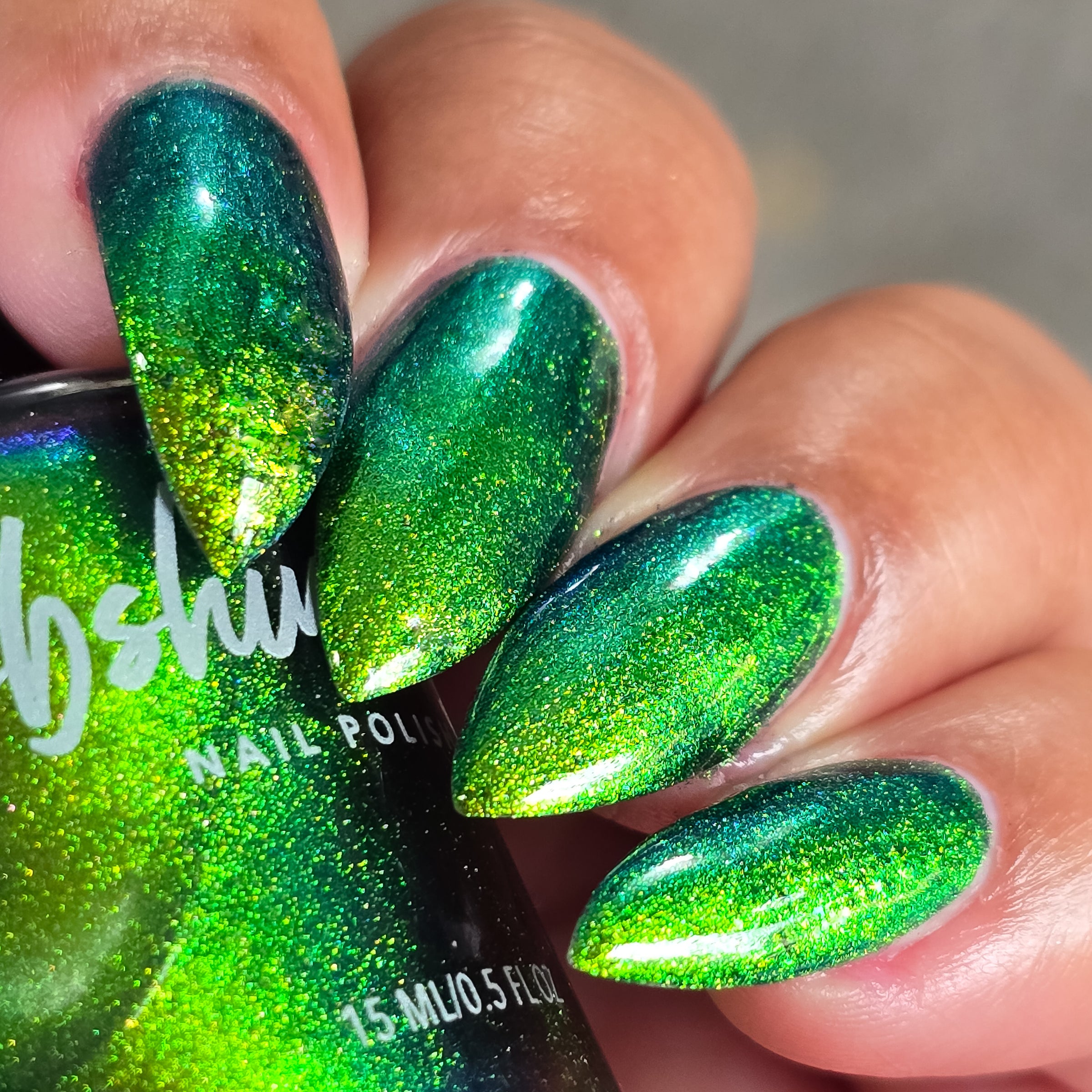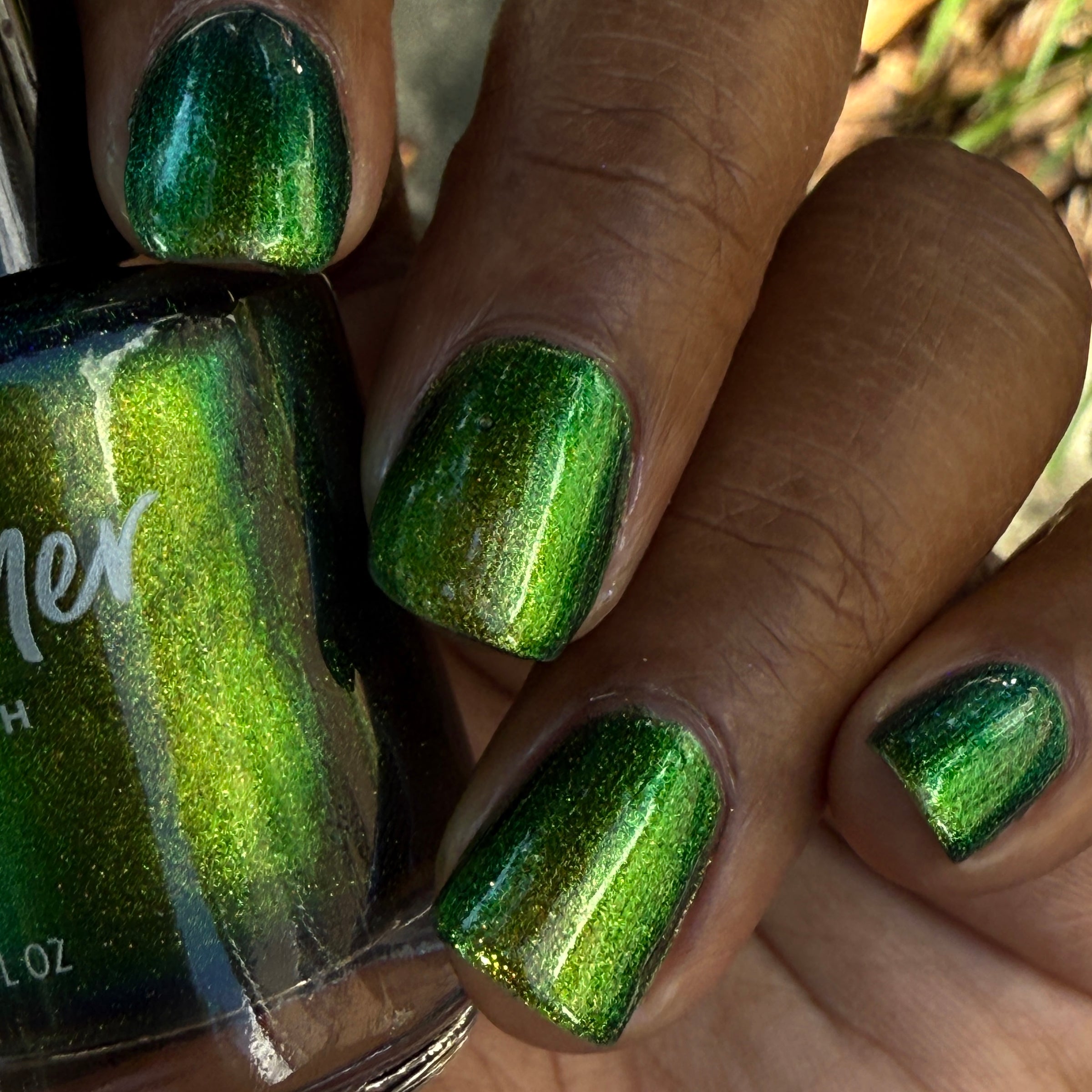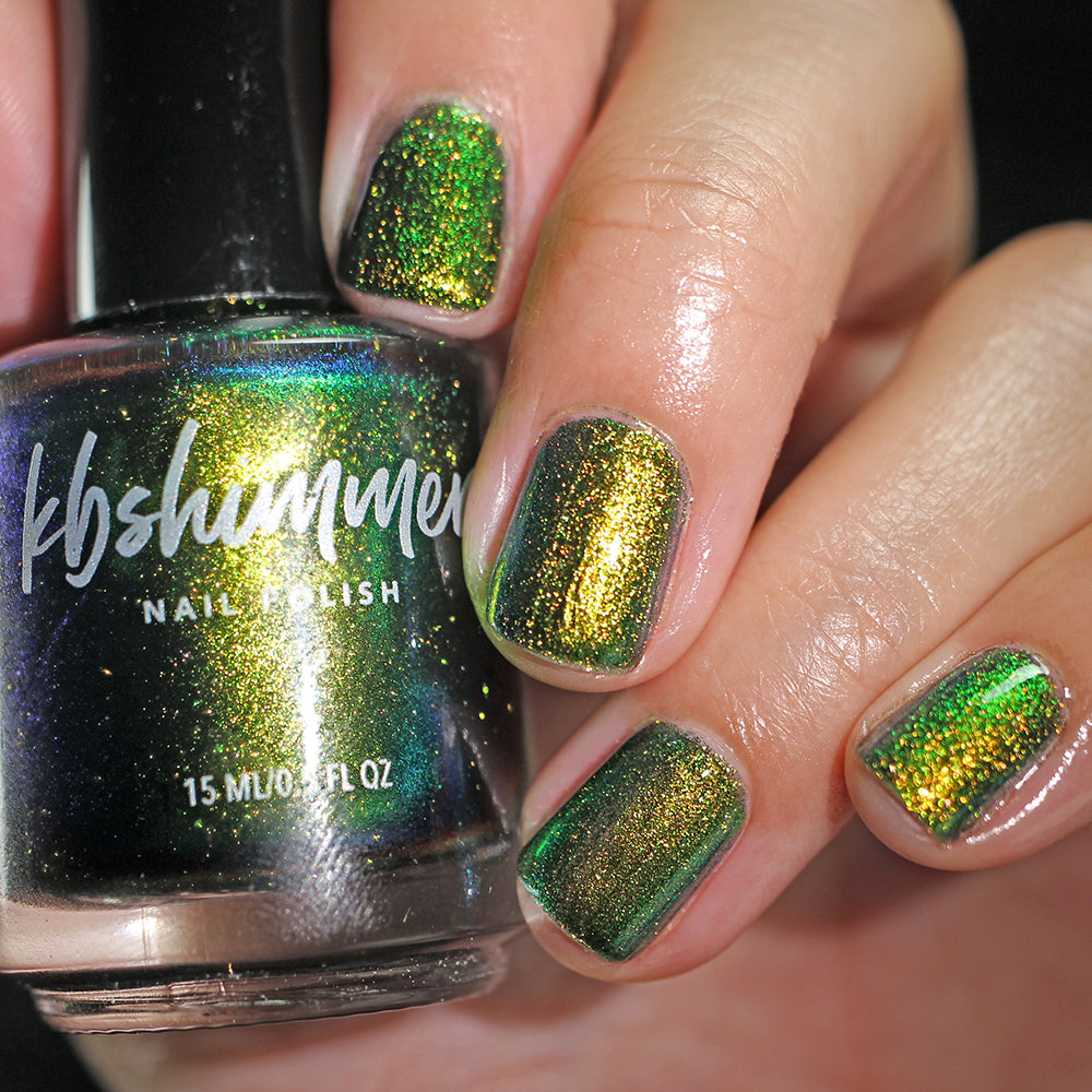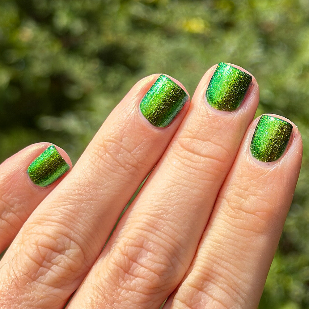 In A Pickle is a vibrant green, multifaceted chrome nail polish that easily catches the eye as it shifts between colors. This multichrome shade features a warm golden hue that accents the green, catching hints of orange, deep blue, and near-navy hues. Best in 2 coats, follow with a quick-dry topcoat like Clearly On Top for best results.