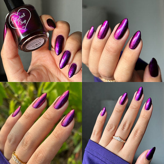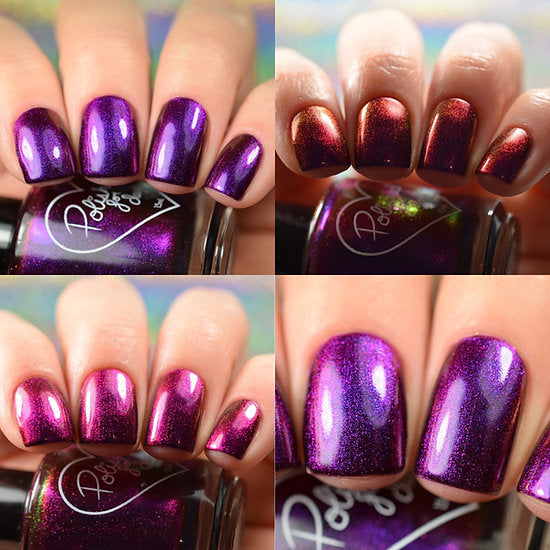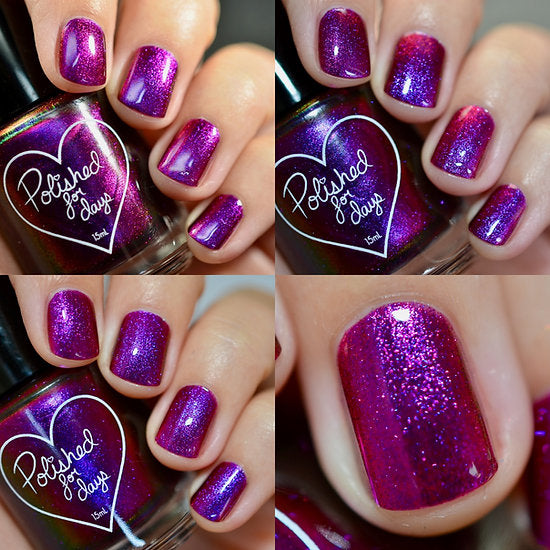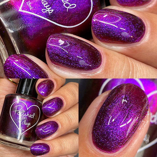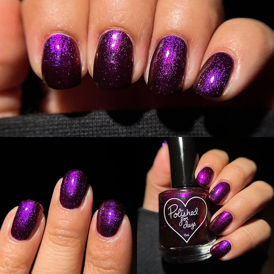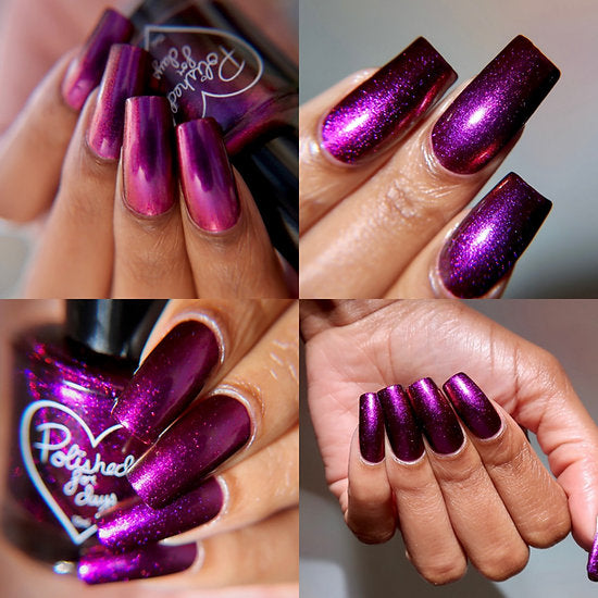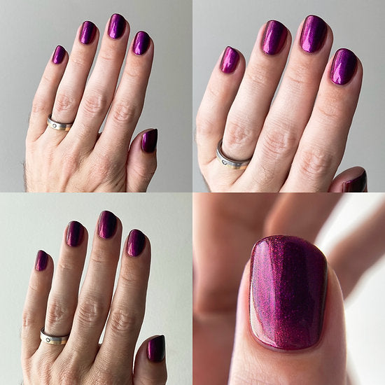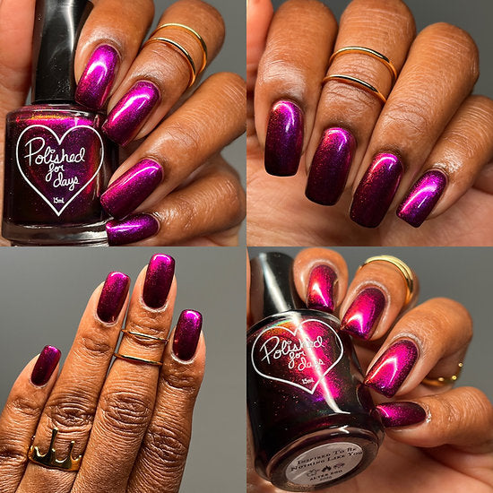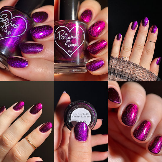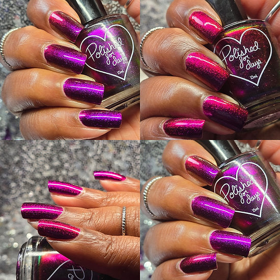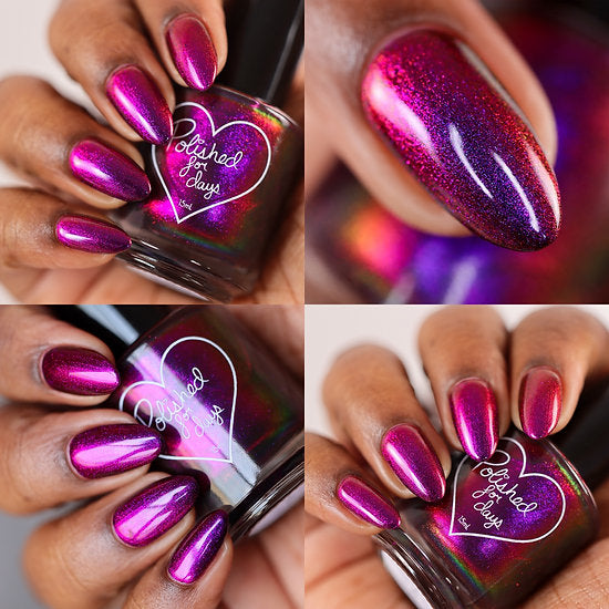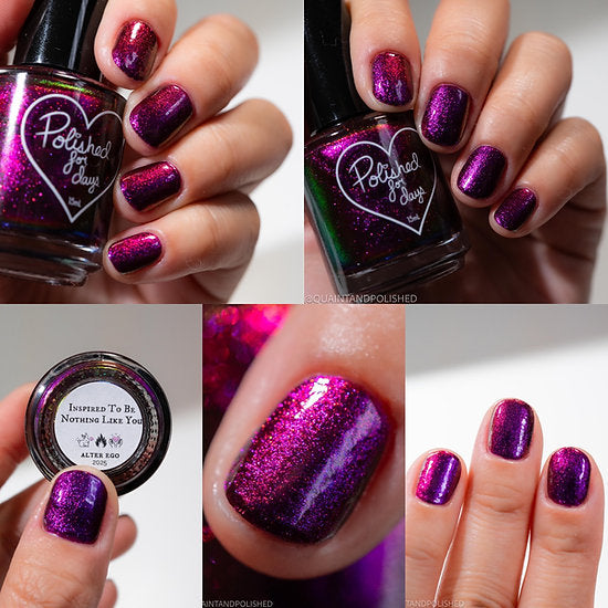 Polished for Days Inspired to be Nothing Like You is a deep red base with a purple-pink-red multichrome micro flake shimmer.