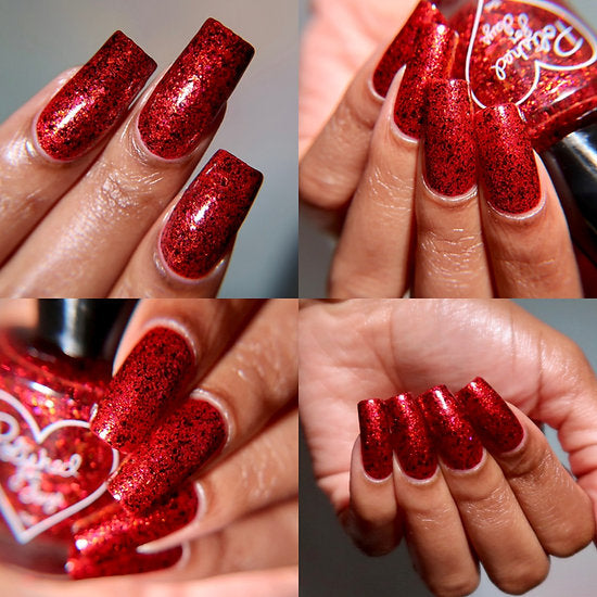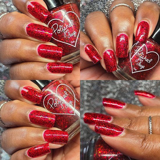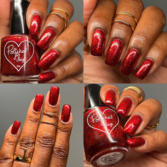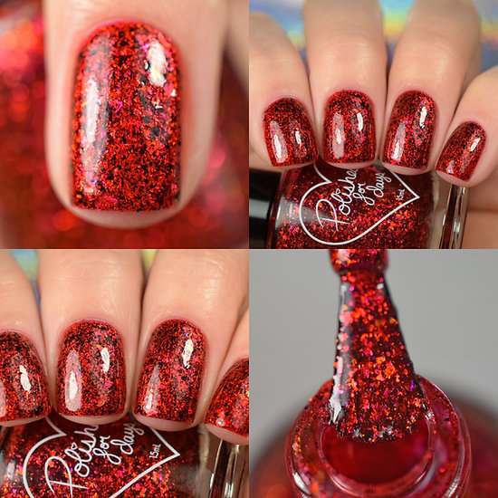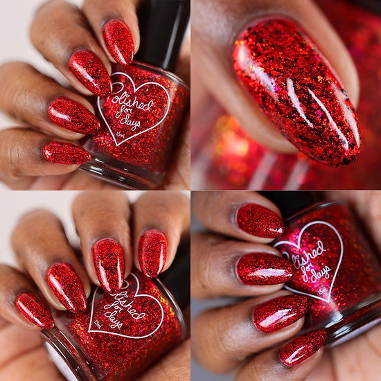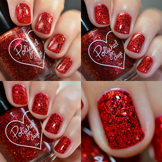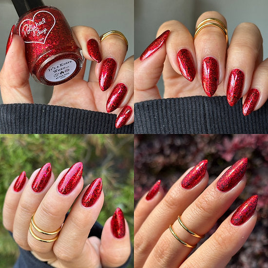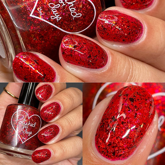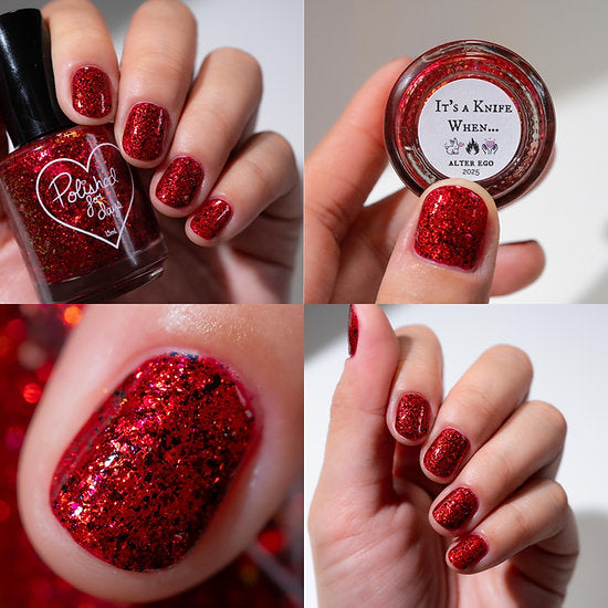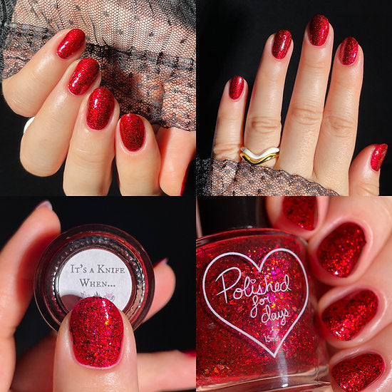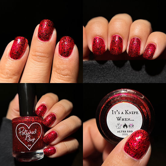 Polished for Days It's a Knife When... is a cherry red base with pink-gold shifting iridescent flakes, orange-green shifting iridescent flakes, tiny black to red shifting flakes and matte black flakes.