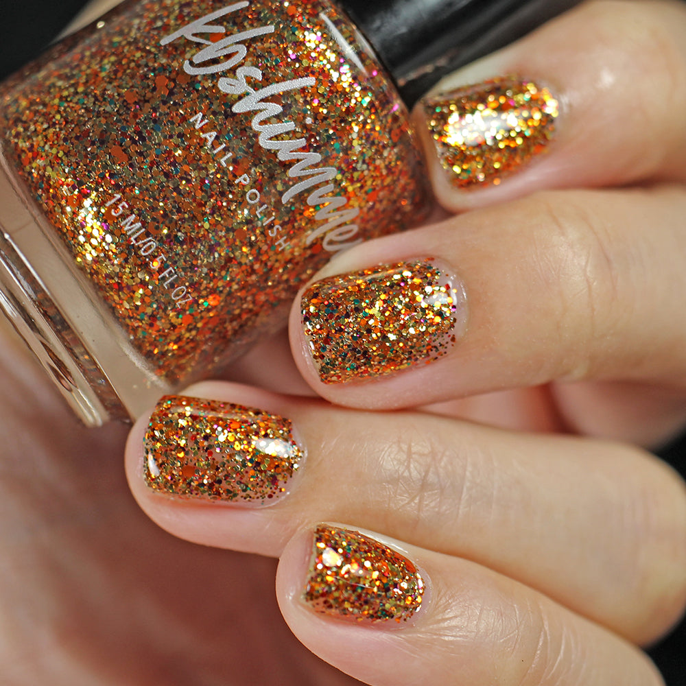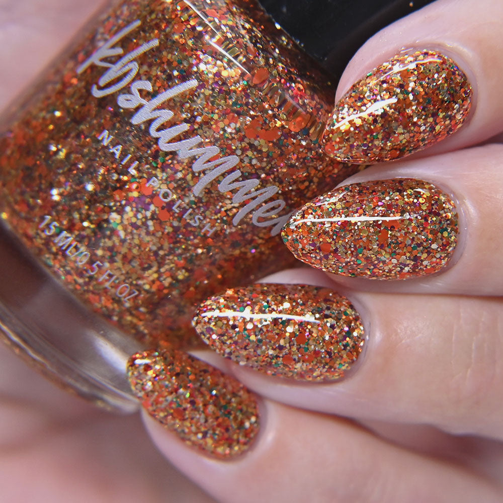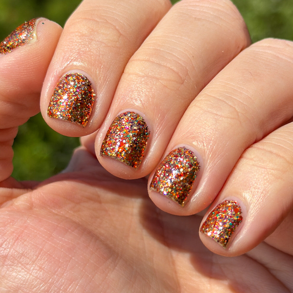 It’s Crunch Time is an autumn leaf–inspired mix of metallic hex glitters in a clear base. Worn in one layer over your favorite autumn crème, the mix of gold, copper, sand, red, burgundy, orange, and green echoes those piles of fallen leaves. Layer in two or three coats for a full-coverage manicure or accent nail perfect for autumn. For a glass-like finish, follow with a coat of Smooth Moves Glitter Topper and a coat of Clearly On Top quick-dry topcoat.