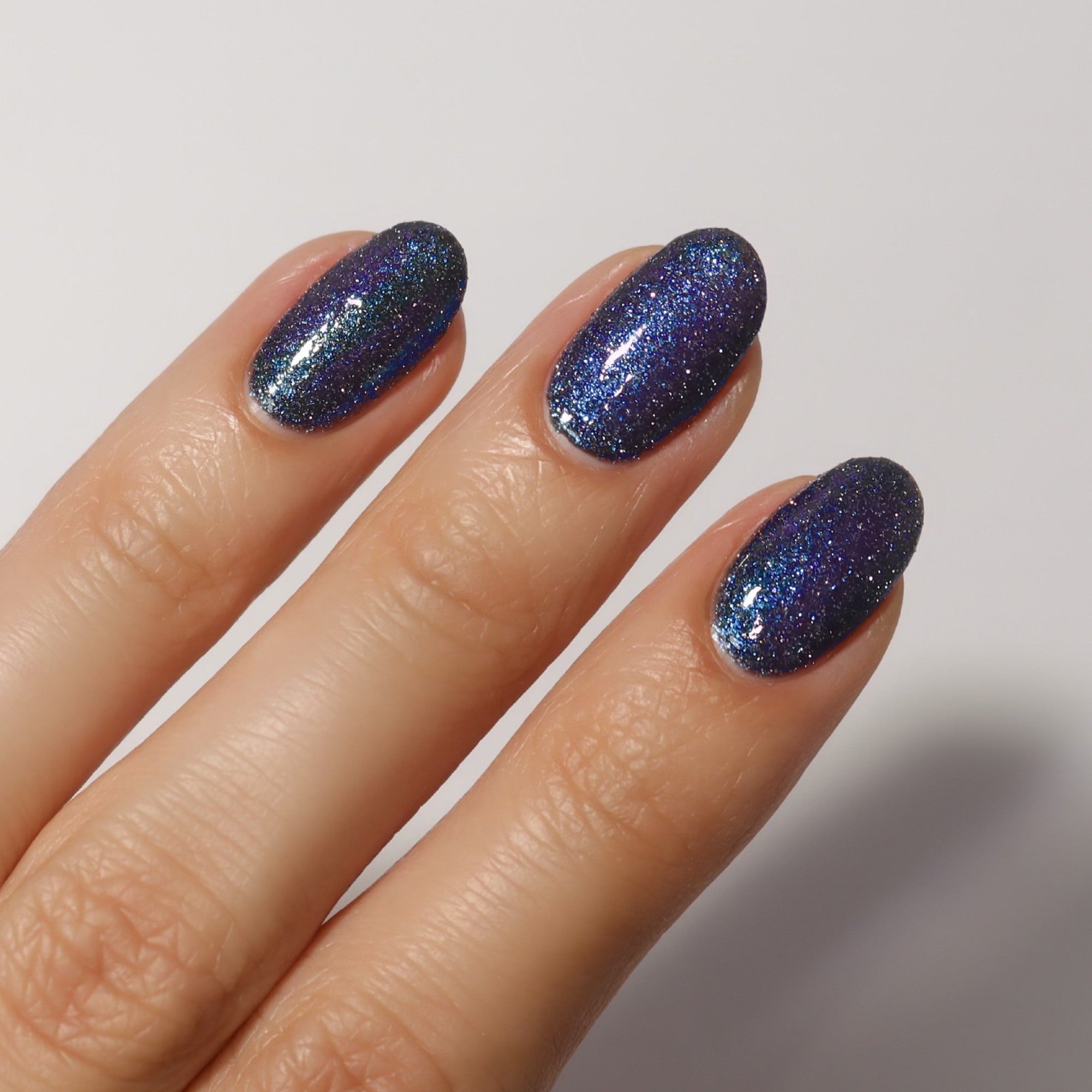 The base is dark as midnight, the kind of black that swallows the light whole. Then the shimmer moves, sliding from cobalt to violet like something alive. When the flash hits, the silver glitter blazes against the dark, a little spark of danger hidden in plain sight.