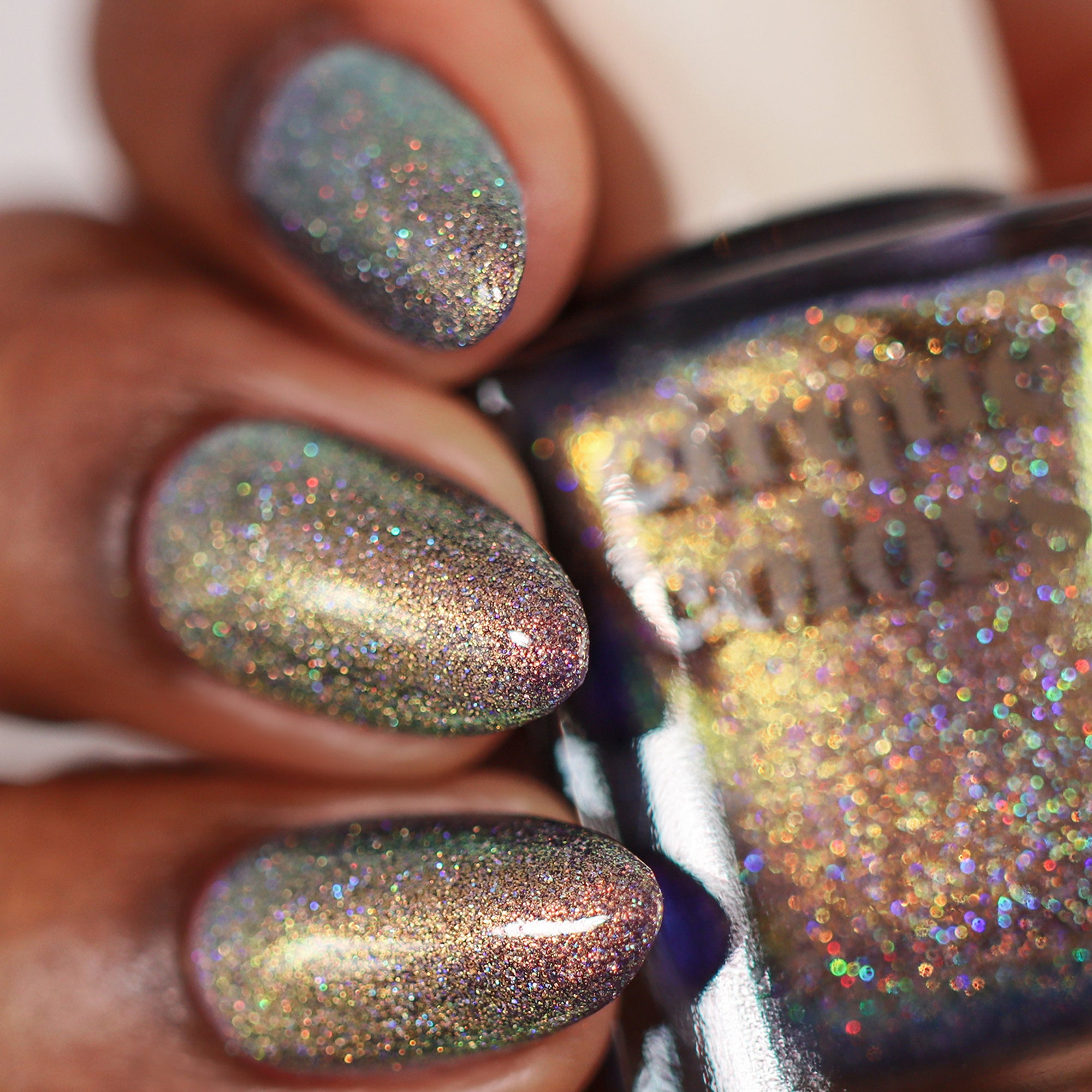 Seer is a dusky purple nail polish with red-gold-green color-shifting aurora shimmer and an intense scattered holographic effect. Our Shimmergraphics™ combine scattered holographic pigments and sparkly color-shifting aurora pigments that reflect direct light (such as sunlight or light from a strong bulb) for an intense sparkle effect.