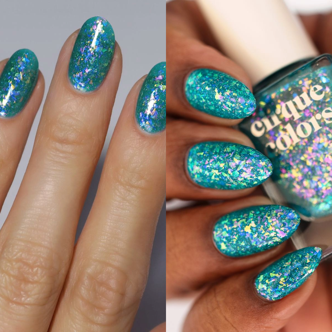 Tailfeather is a teal nail polish with rainbow iridescent flakies and a scattered holographic effect. The mix of bold teal and shimmering rainbow flakies creates a dazzling, multidimensional finish.