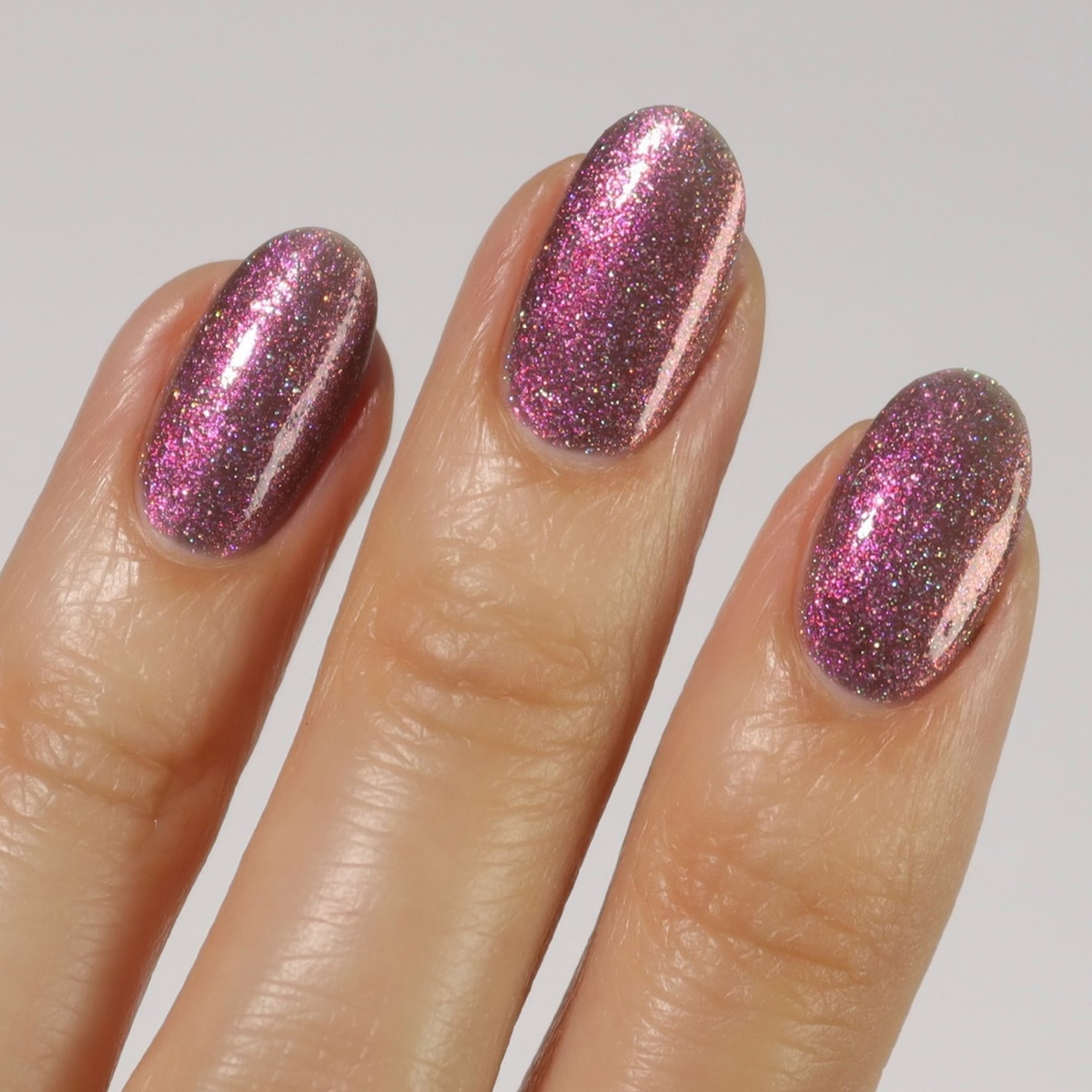 Tarot is a rosewood taupe nail polish with magenta-gold-green color-shifting aurora shimmer and an intense holographic effect. Our Shimmergraphics™ combine scattered holographic pigments and sparkly color-shifting aurora pigments that reflect direct light (such as sunlight or light from a strong bulb) for an intense sparkle effect.