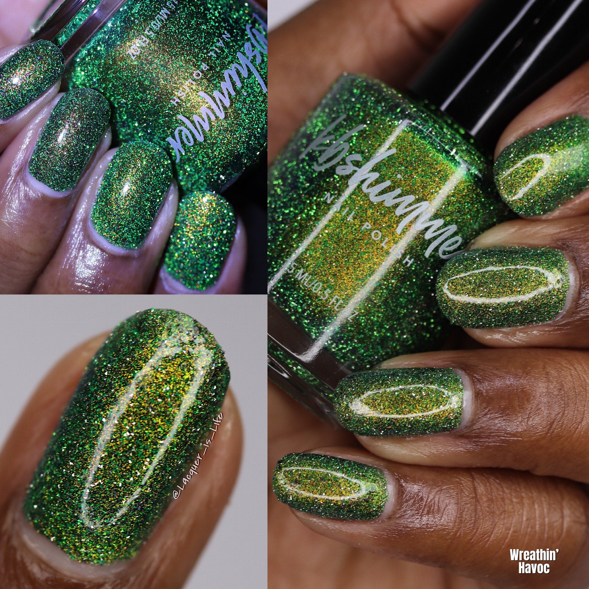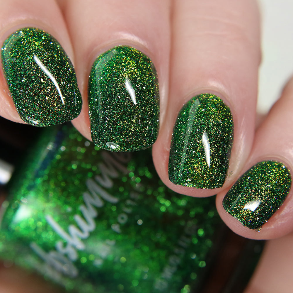 Wreathin' Havoc reflective nail polish is a nod to holiday wreaths. This reflective shade is unique with its color-shifting multichrome base. It features a hint of warm gold that accents the pine-green foundation, catching glimpses of Kelly green and blue at different angles. In brighter light, the reflective glitter flashes hues of golden lime. Best in two coats—follow with Smooth Moves and Clearly On Top for a glass-like finish.
